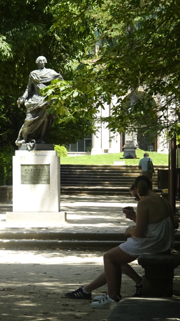 Tiene otro mérito, el de ofrecernos a pocos metros un banco sombreado. Un poco más arriba nos espera Carlos Linneo, bajo un sol de justicia y rodeado de césped verde. Es sabido que los suecos viajan a España con la intención de broncearse al bode del Mediterráneo o en las islas Canarias, pero este sueco se curtió más bien recorriendo miles de kilómetros a lo largo de sus 70 años de vida, para fundar la moderna clasificación de plantas, animales y minerales. Este busto, obra de José María Rubio está ahí desde 1859.