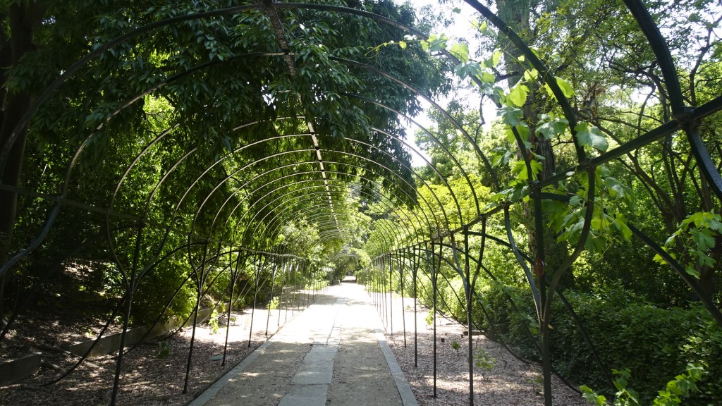 Recorrido de la larga pérgola flanqueada por las especies ibéricas de vides. Foto R.Puig