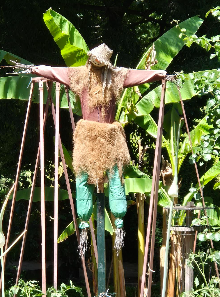 que nos lleva a la «huerta del Jardín Botánico», donde un cartel nos recuerda entre flores que está prohibido llevarse frutos. Y por si nos entrase la tentación de robarnos un repollo, hay un guardián que nos espanta