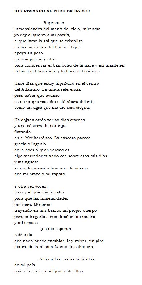 Sobre él han escrito otros más cualificados que yo y creo que su formulación poética de las cosas más naturales de la vida es una de esas características de su creación que lo hacen más cercano. En mi caso hay un poema en el que versifica sus sensaciones en el barco que le trae de regreso al Perú, publicado en la edición citada (pp. 218-219).
