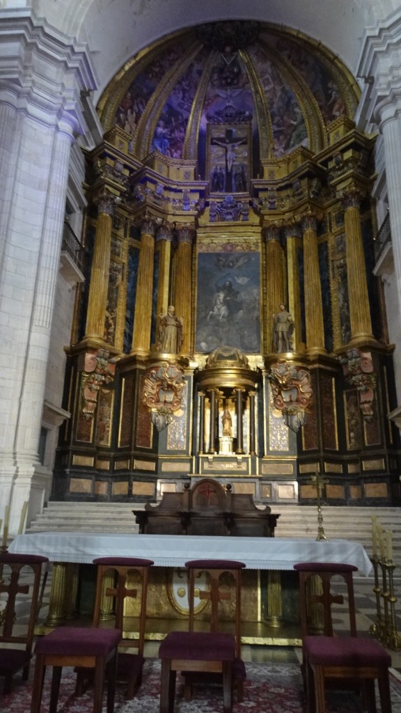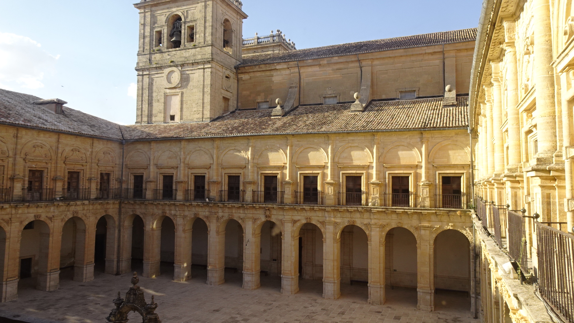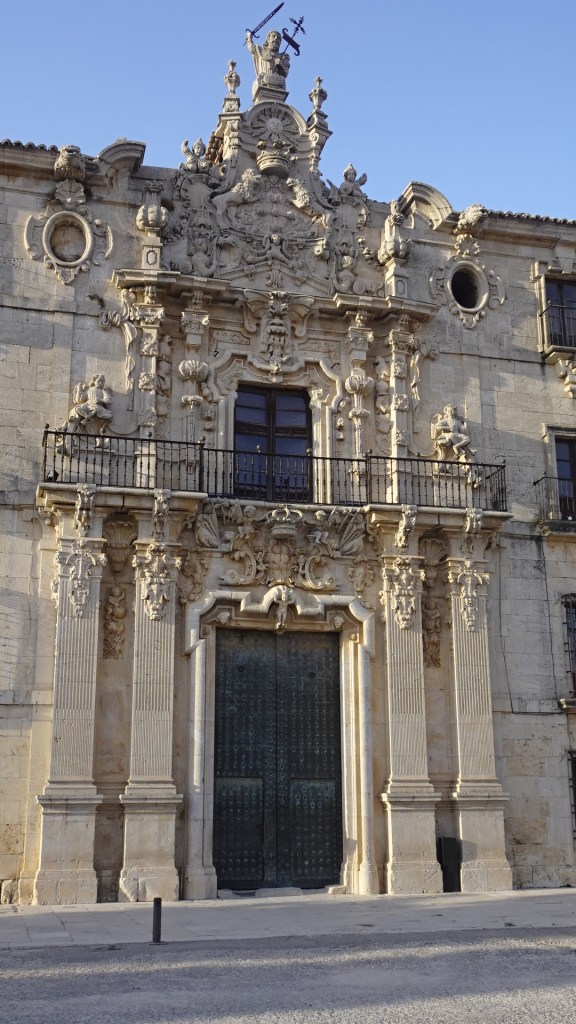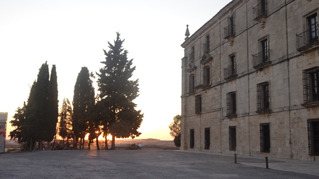 Al día siguiente, nos guíó durante la visita una docta concejal del ayuntamiento de Uclés, a la que accedimos por la puerta de la fachada principal, donde no podía faltar Santiago, apodado matamoros, el patrono de la Orden, cabalgando en su caballo en plena batalla de Clavijo, dorado por la tranquila luz del atardecer de la llanura conquense.