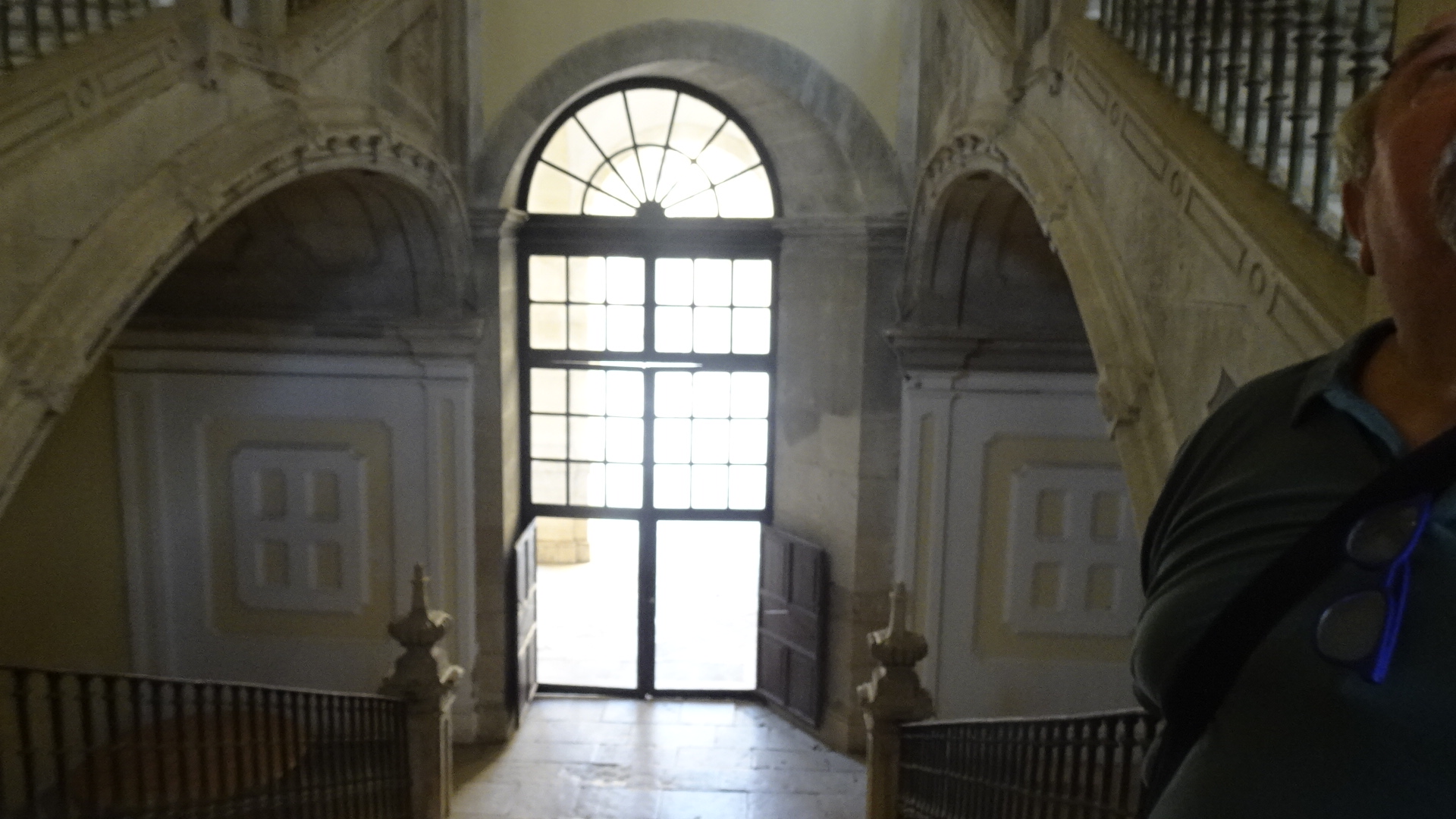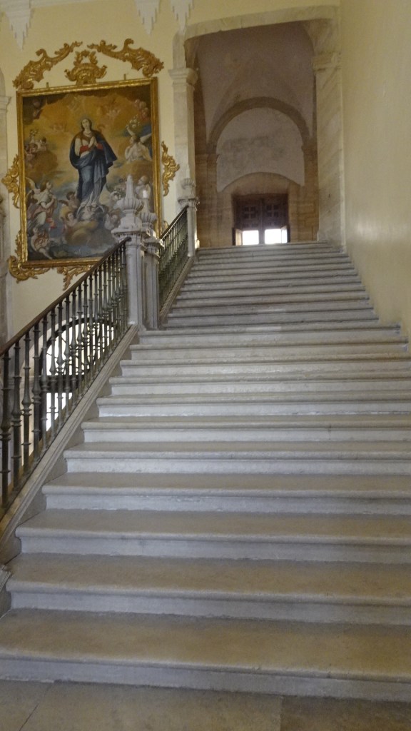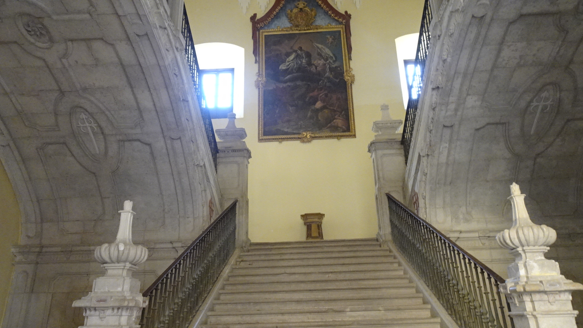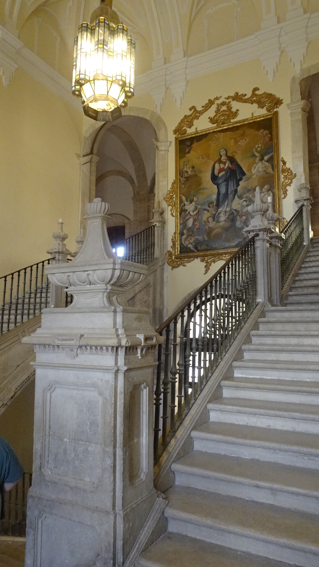 Recorriendo la galería porticada del patio llegamos a la escalinata que nos lleva a la galería superior, de un diseño arquitectónico ingeniosamente descentrado, obligado por las bóvedas que ha de vincular en su ascenso entre los dos pisos de la obra.