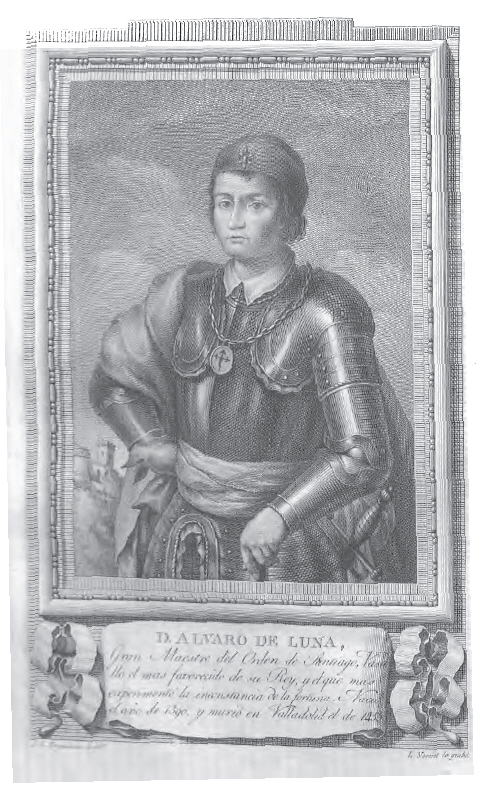 Don Álvaro de Luna en un grabado de Luis Fernández Noseret (finales del siglo XVIII) desde dibujo de José López Enguidanos en Retratos de Españoles ilustres, Real Imprenta de Madrid.