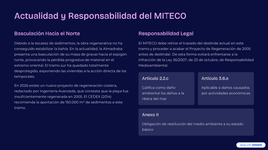 En la Playa de la Almadraba de Els Poblets en la provincia de Alicante en España la Dirección General de Costas, Ministerio de Transición Ecológica y Reto Demográfico (MITECO) ha comenzado en setiembre del 2025, basándose en su revisión de los deslindes de la costa, a expropiar a los propietarios de la primera línea de sus propiedades, erigidas durante años con todos los permisos necesarios y pagando todos sus impuestos, decretando el derribo a costa del propietario de todas las vallas de la primera línea, la definida como servidumbre de tránsito, con la obligación de demoler todo obstáculo al tránsito y una doble servidumbre a la propiedad privada: 1) En los primeros seis metros a partir de la línea marítimo-terrestre obligación de demoler todo obstáculo; 2) En los siguiente catorce metros se permitirán obras de mantenimiento, pero quedan prohibidas obras de ampliación o de aumento de volumen de habitación, quedando al arbitrio de la autoridad permitir o no intervenciones en caso de riesgo estructural.