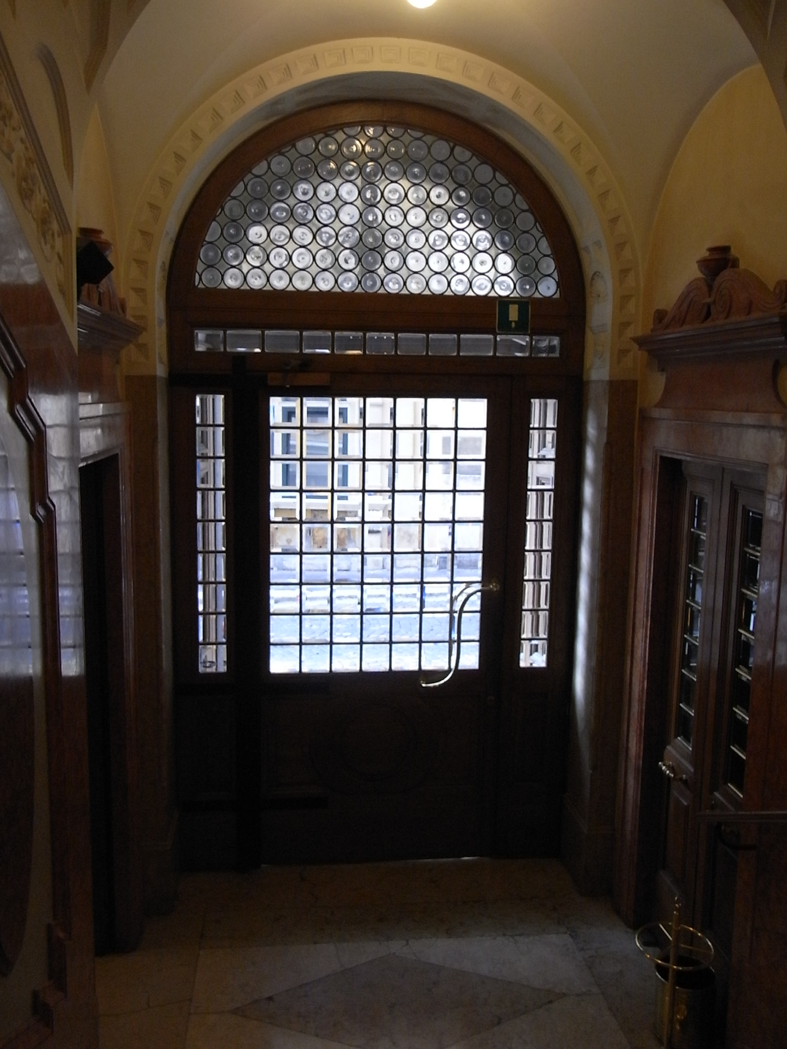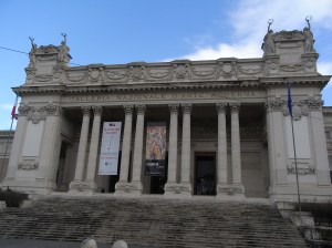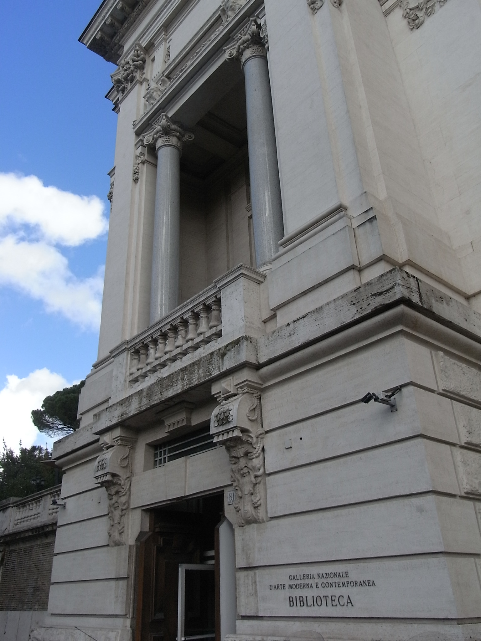 La reestructuración en curso del edificio de la Hertziana implica que sus fondos se consultan transitoriamente en los locales de la Biblioteca de la Galleria Nazionale d’Arte Moderna (GNAM). Una vez obtenido el carnet de la Hertziana en su la sede central, me dirigí a la sala de consulta al costado de la fachada de la GNAM. De nuevo sólo tengo elogios para el personal de la sede central y los asistentes de la apacible sala de lectura, tanto de la Hertziana como de la biblioteca de la GNAM, cuya puerta de entrada se ve en la imagen siguiente.