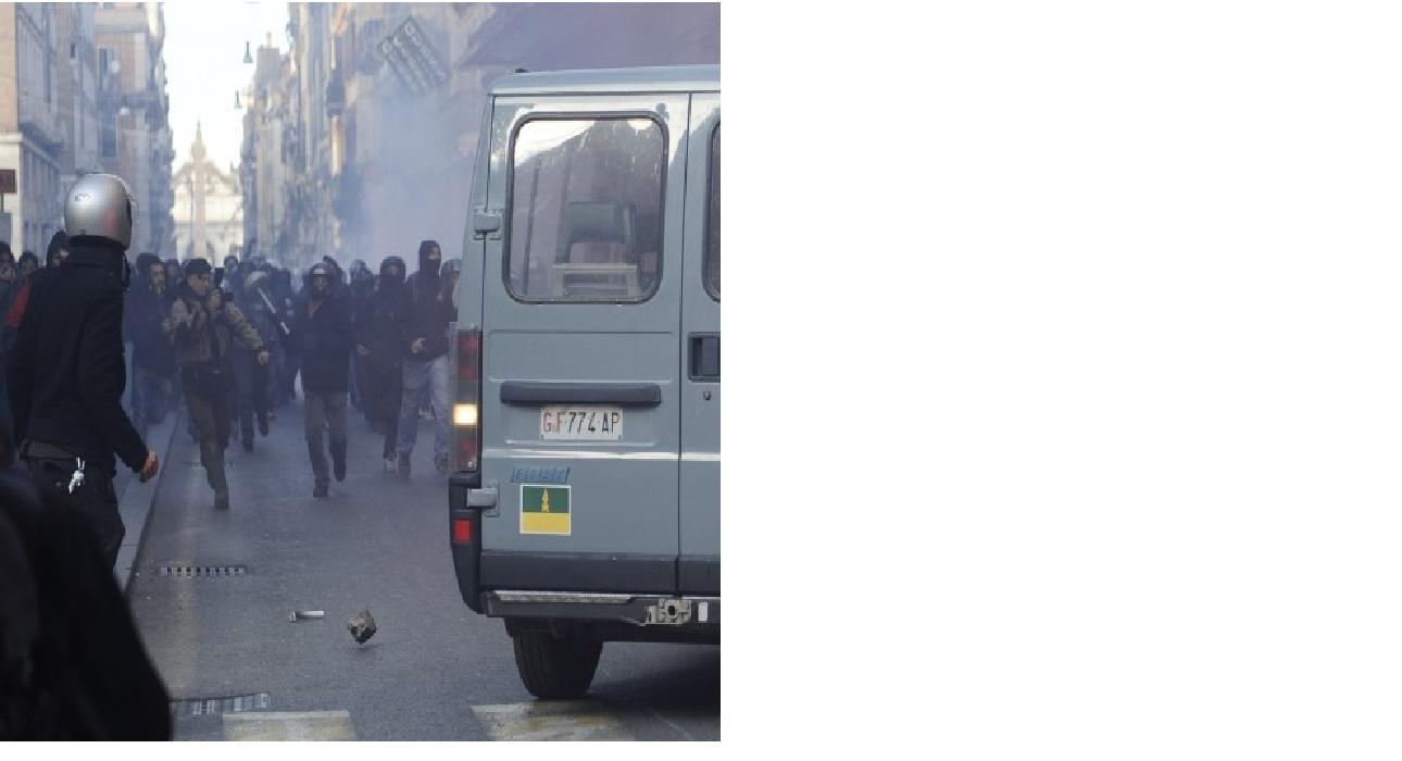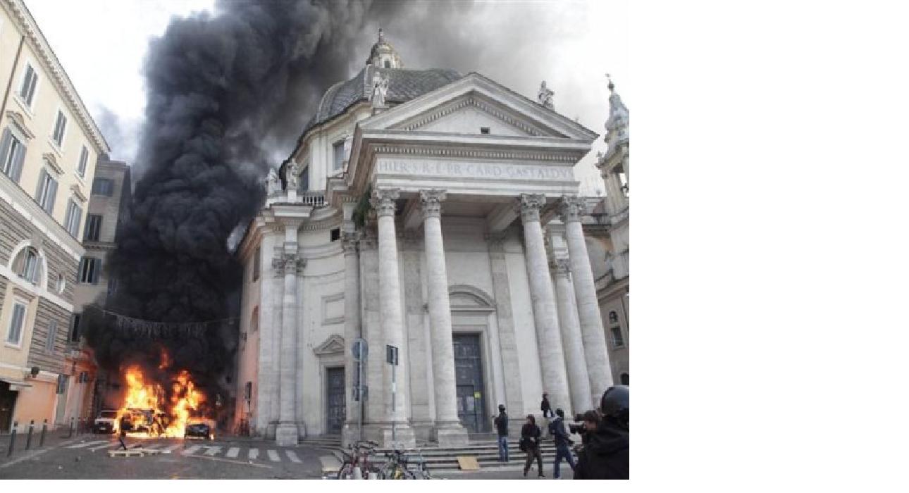En la misma plaza, hace menos de veinticuatro horas, otro Piranesi podría haberse inspirado en algo parecido a la erupción del Vesubio. Con ocasión de las protestas por la reforma universitaria y las manifestaciones contra los chanchullos de Berlusconi para mantener el poder y su impunidad se auto-convocaron también los habituales partidarios del sistema de la capucha y la barra de hierro (foto La Repubblica).