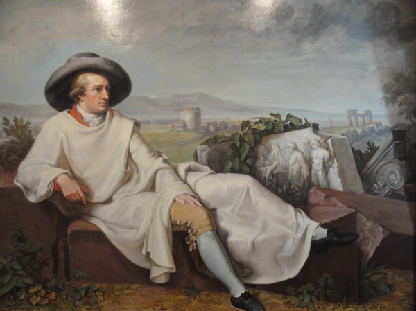 Pero volvamos al romanticismo apolíneo de nuestro poeta. De modo natural, teniendo la campiña romana a dos pasos, el amigo pintor y anfitrión de Goethe le retrata sentado sobre un obelisco: “apareceré de tamaño natural con ropaje de viajero, envuelto en una capa blanca, sentado al aire libre sobre un obelisco caído, en trance de contemplar las ruinas de la campiña romana en la lejanía” (Viaje por Italia, 29 diciembre de 1786), la imagen corresponde al detalle de una copia de este cuadro en la casa museo que estamos visitando.