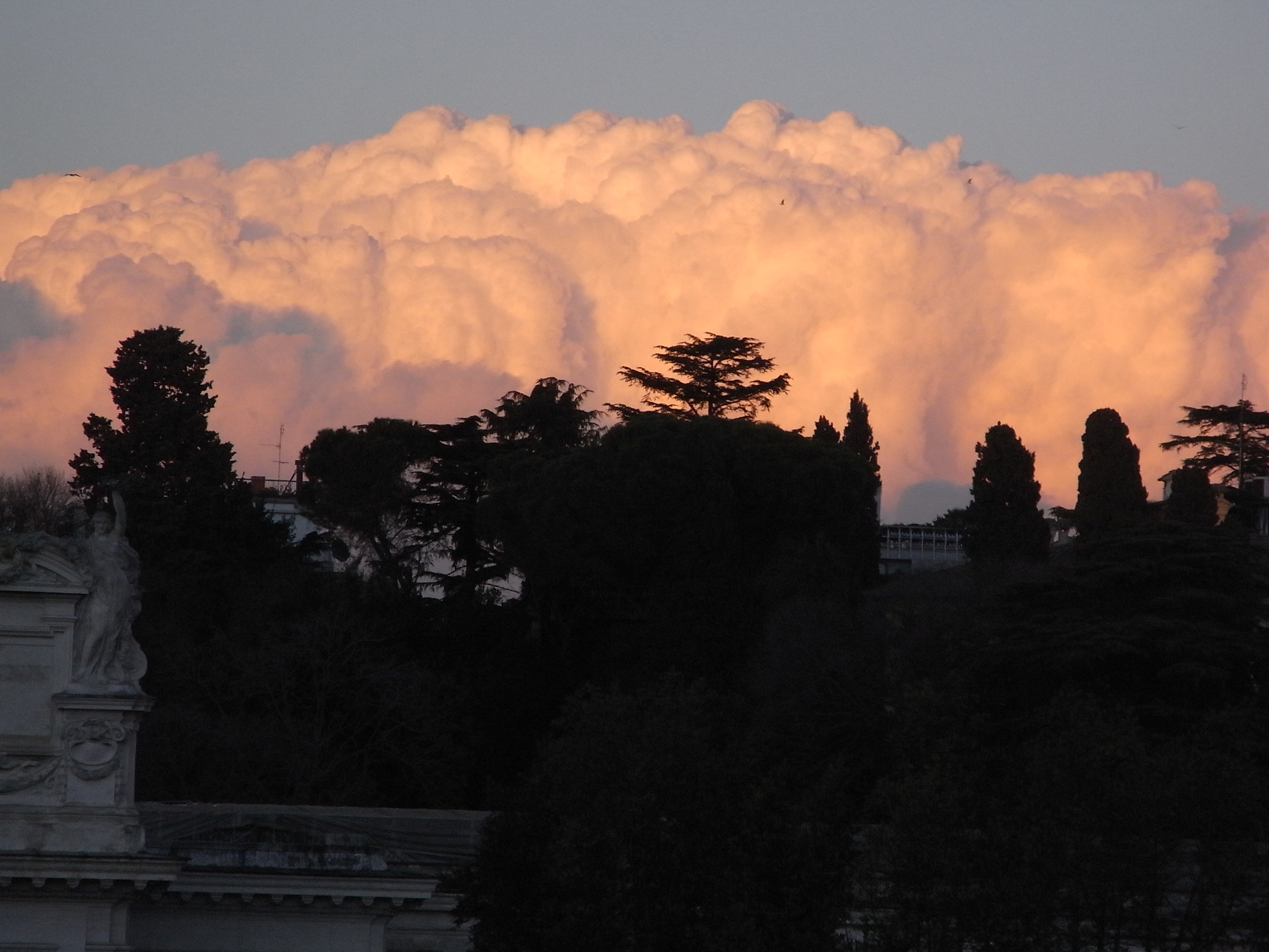 Pues bien, yo creo que somos muchos los que nos encandilamos con las nubes. Para antropólogos y filósofos que buscan distinciones entre el ser humano y los seres puramente animales ofrezco una nota distintiva más: el ser humano es aquel que tiene la capacidad innata de admirar las nubes. Eso de “estar en las nubes” no es tan malo como nos hacían creer en el colegio. Y la situación geográfica de Roma creo que se presta mucho a la “caza de nubes”.