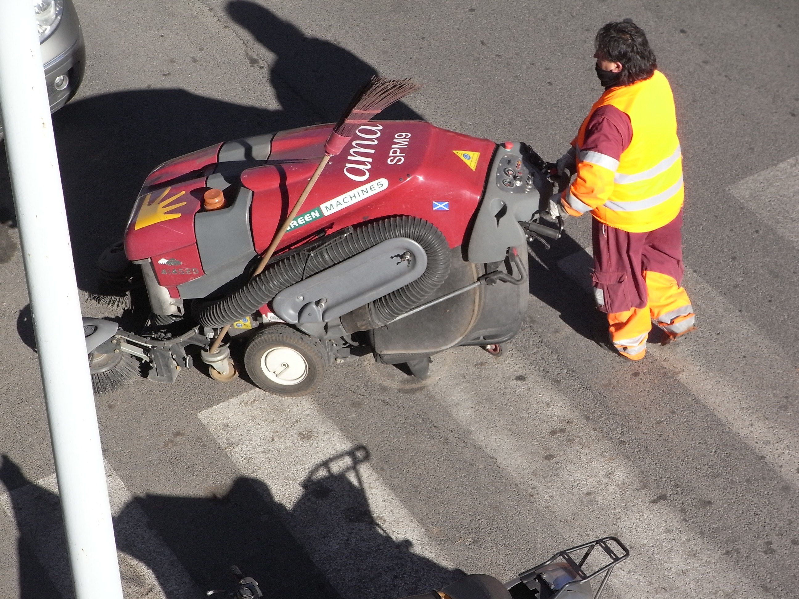 En Roma hay un ejército de estos industriosos obreros, perseguidores de la basura y la roña. El nombre tradicional venía de spazzo, es decir el empedrado, y el spazzino era el que limpiaba el empedrado con escobón y manguera, aquella manga-riega (que aquí no llega). Ahora los escobones son vehículos mecánicos y el riego se hace con camiones de riego, pero Roma sigue siendo la capital del adoquín.