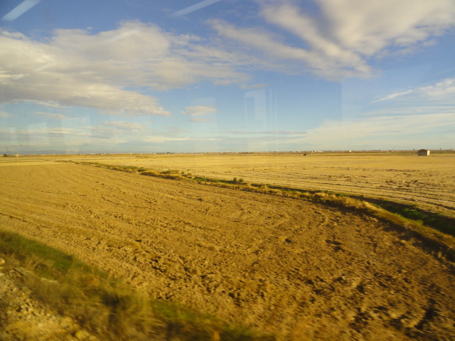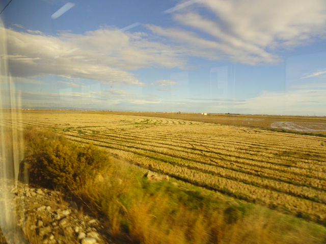 Por la ventanilla se van también desplegando extensas perspectivas: lejanías de Levante, de la meseta norte, de la Cataluña pre-pirenaica, de los olivares béticos, de las planicies manchegas, de los Monegros…  El domingo, antes de ser empaquetado en el avión que me expediría a Roma, desde el tren que me acercaba a Valencia y me alejaba de Els Poblets, del lado del mar, ya después de Cullera, se adivinaba el espejo de la Albufera y los arrozales desfilaban en diferente sazón. ¡Los variados estados del arrozal valenciano!