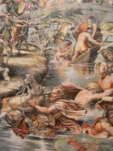No se sabe de qué raza era el pescado de San Benno, pero pienso que era un tipo de carpa ‘ferrófaga’ que ha pululado desde hace siglos por los ríos de Europa. Después de la batalla de Puente Milvio (es un puente que puedo ver desde mi balcón), de la que ofrezco un detalle tomado de un cuadro de Giulio Romano, basado en una composición de Rafael,el pez de marras debió darse un atracón de chatarra.