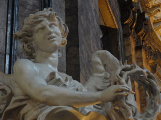 Así como los dos soberbios ángeles que Bernini esculpió para el exterior del Castel Sant’Angelo, pero que, con objeto de evitar su deterioro, fueron sustituidos allí por copias y los originales trasladados a este pequeño templo.