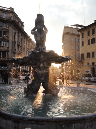 Enseguida llegamos a la famosa fuente de Bernini con sus caricaturescos delfines que sustentan al tritón, en el centro de la plaza Barberini.De ella arranca la famosa calle de Vittorio Véneto, inmortalizada (¡han pasado siglos!) por la Dolce Vita de Fellini.