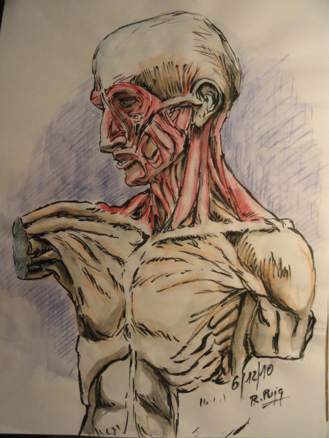 Por el momento estoy en la fase de dibujar el frente de las dos figuras. Luego habrá que realizar una parte del cuerpo de las cuatro imágenes, pero decorticada, mostrando los músculos del sotto pelle, algo parecido a esto:
