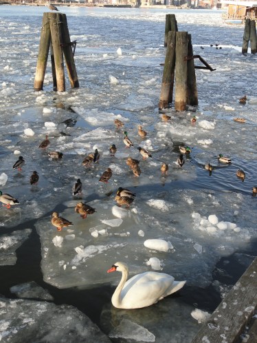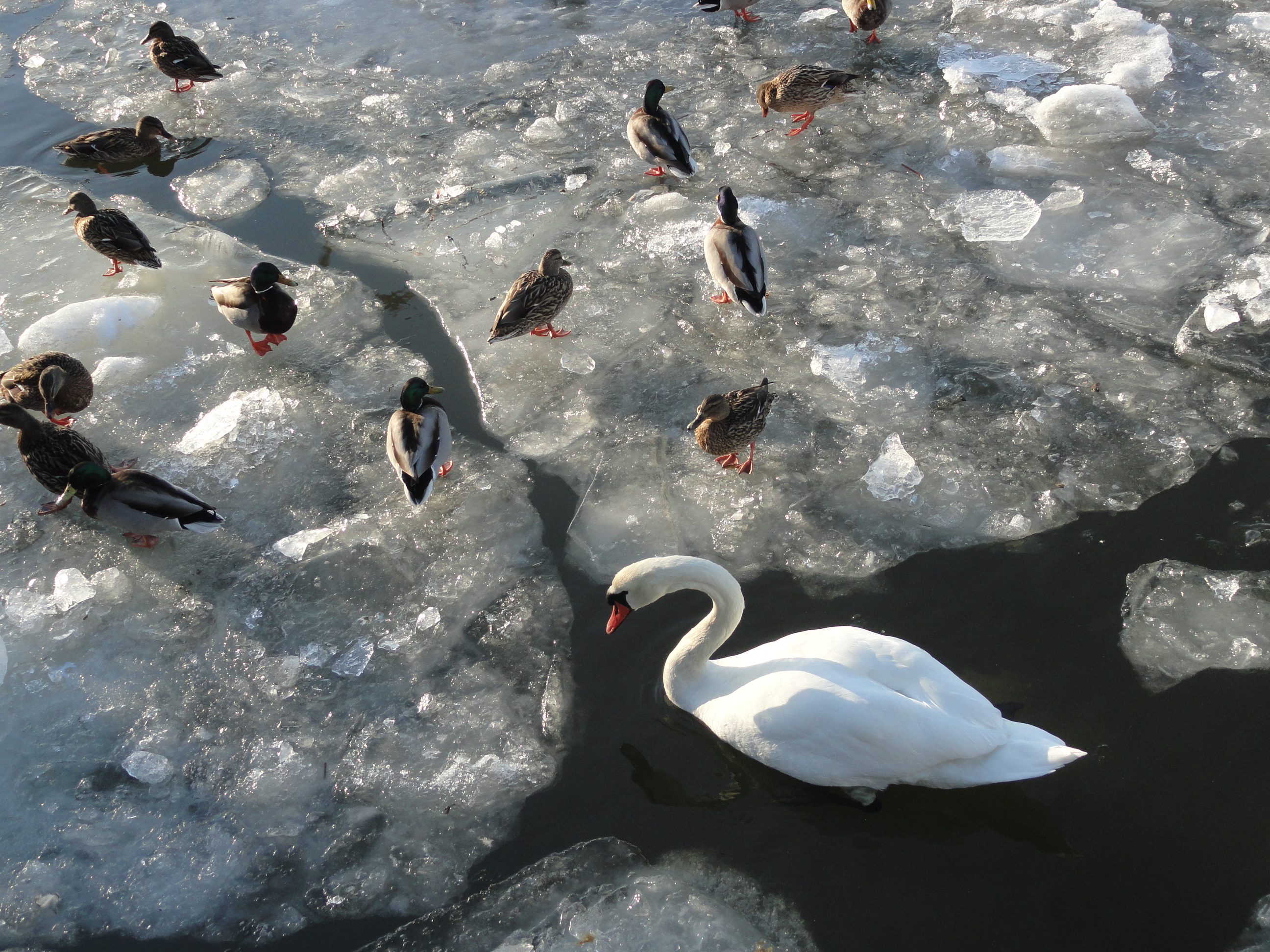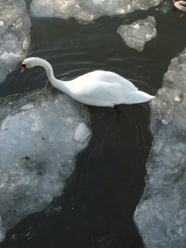 He leído que los cisnes de Siberia hibernan en el Gloucestershire en Inglaterra. No así los cisnes que se quedan en el canal de Gotemburgo, pasando de un témpano de hielo a otro como si tal cosa; o al menos este que el pasado domingo se acercaba al borde con la esperanza de que yo llevase algo de pan en mis bolsillos.
