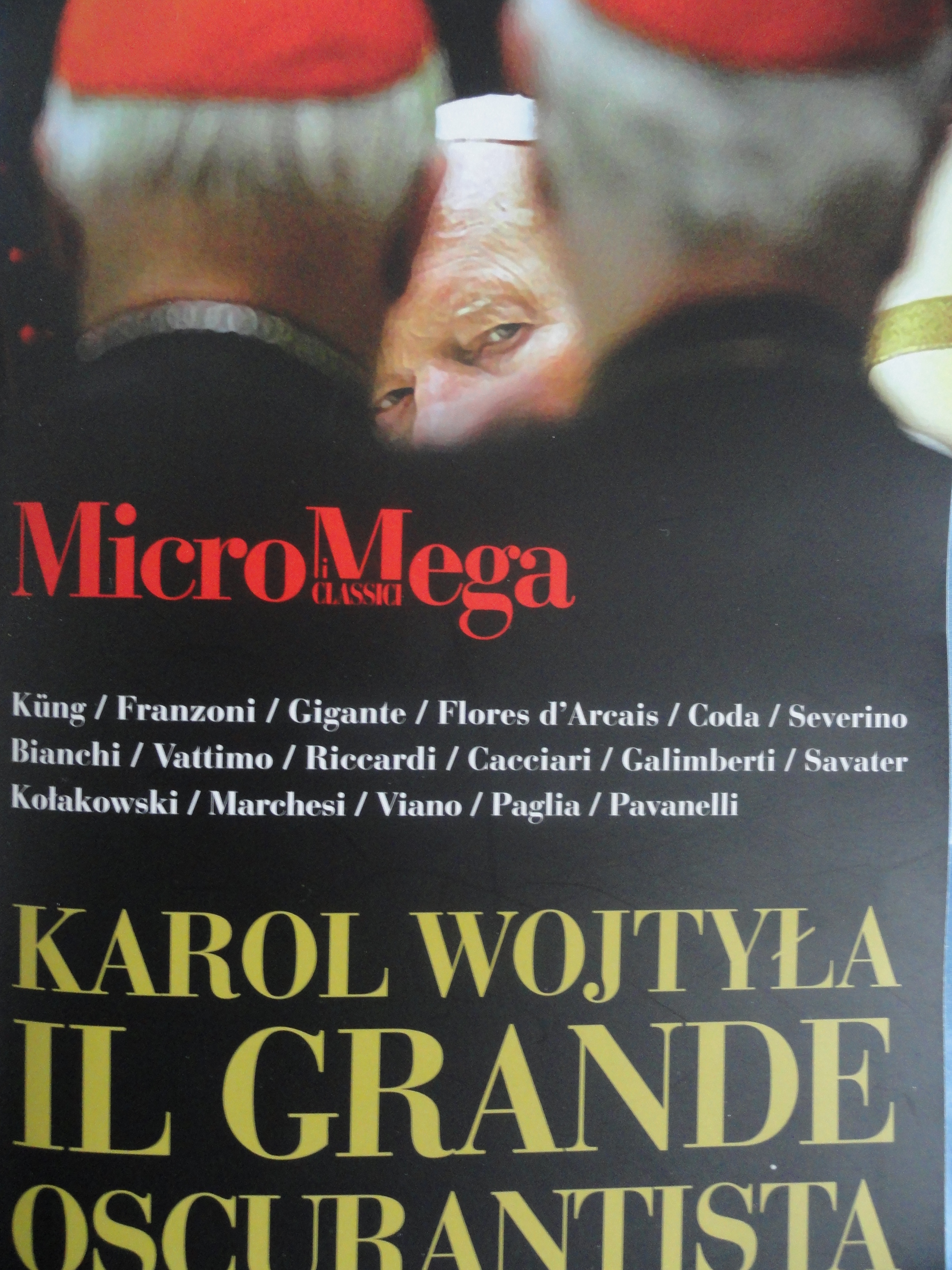 Ya que he dado publicidad a un DVD vaticano no está de más, para equilibrar las cosas, que mencione a quienes la piensan distinto. La muy seria y concienzuda revista MicroMega, dirigida por Pablo Flores d’Arcais, ha sacado a la calle (aunque los vendedores de prensa la sacan de la tratienda cuando la pides) un número monográfico bajo el explícito título de Karol Wojtyla il Grande Oscurantista, que se abre con un artículo del teólogo católico Hans Küng,