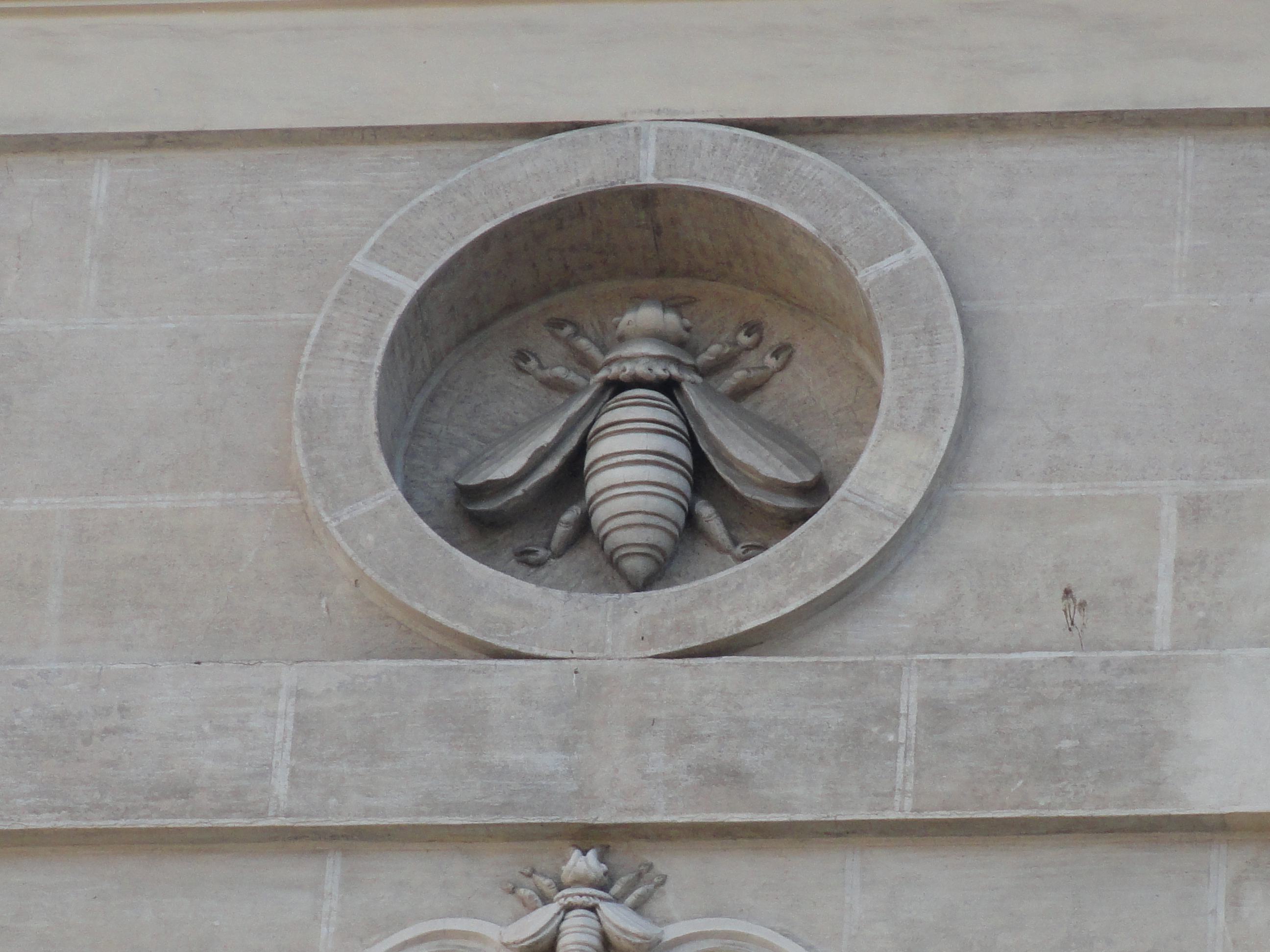 Aquí, bajo el alero del patio de Sant’Ivo alla Sapienza las abejas reina seguían en su puesto. No en vano son el símbolo heráldico del papa Urbano VIII Barberini, un pontífice más bien mandón y nepotista. La verdad es que el abdomen de las aquí vemos se parece a una mitra papal invertida. Por cierto que el número 141 de la revista Abeilles & Cie de Bélgica publica el interesante y docto artículo titulado Les abeilles des Barberini de Agnès Fayet, con fotos facilitadas por este blog.