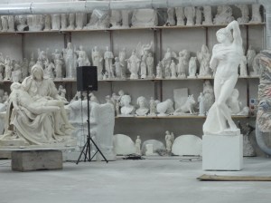 Mientras tanto, la Accademia di Belle Arti de Carrara, emplazada en un edificio del siglo XVIII, lucha contra la decadencia de la calidad creativa, sin demasiados medios, aunque orgullosa de sus glorias pasadas. Apreciamos aquí las escalinatas de este histórico edificio, en el que se han formado muchas generaciones de escultores del mármol.
