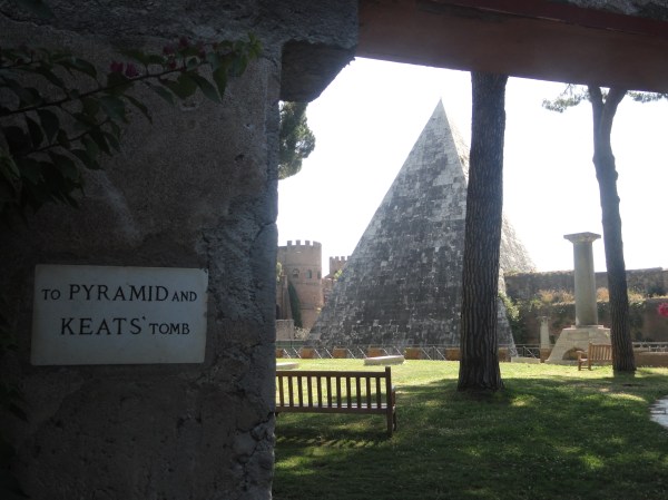 Como reconocimiento a Keats por la garantía que su tumba supone para este lugar melancólico, a las espaldas de la pirámide mausoleo de Cayo Cestio, trascribo aquí la primera estrofa de su oda a una urna griega. Si la traducción castellana mereciese vuestras críticas, yo soy el único culpable.