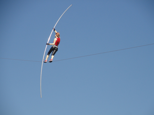 ¡Cielo santo! «Un soneto me manda hacer Violante y en mi vida me he visto en tal aprieto», que diría Lope de Vega… ¡Esto sí que es control de calidad! La verdad es que no lo había pensado, así que me imagino (si hemos de analizar la cuestión según las reglas de la ISO 2000) que del mismo modo que un equilibrista vivo, mediante un calculado reparto de pesos y contrapesos consigue mantenerse sobre el cable… De hecho en la foto de detalle se ve que entre el pie y la pértiga hay una varilla que los une, y pienso que, entre el peso de la pértiga y el peso del cuerpo, se consigue que el centro de gravedad del conjunto se sitúe a la altura del cable, digamos que a mitad de la varilla (probablemente el plomo se concentra en las zapatillas y en la parte baja de la pértiga) de modo que la figura, solidamente atornillada por la planta de los pies, no bascule… ¡¿Por qué no me he dedicado a físico?! :-)))