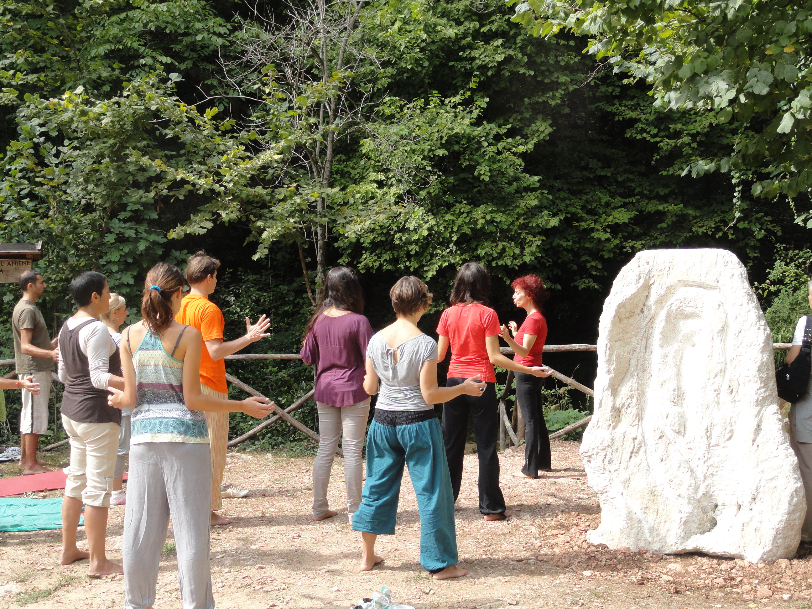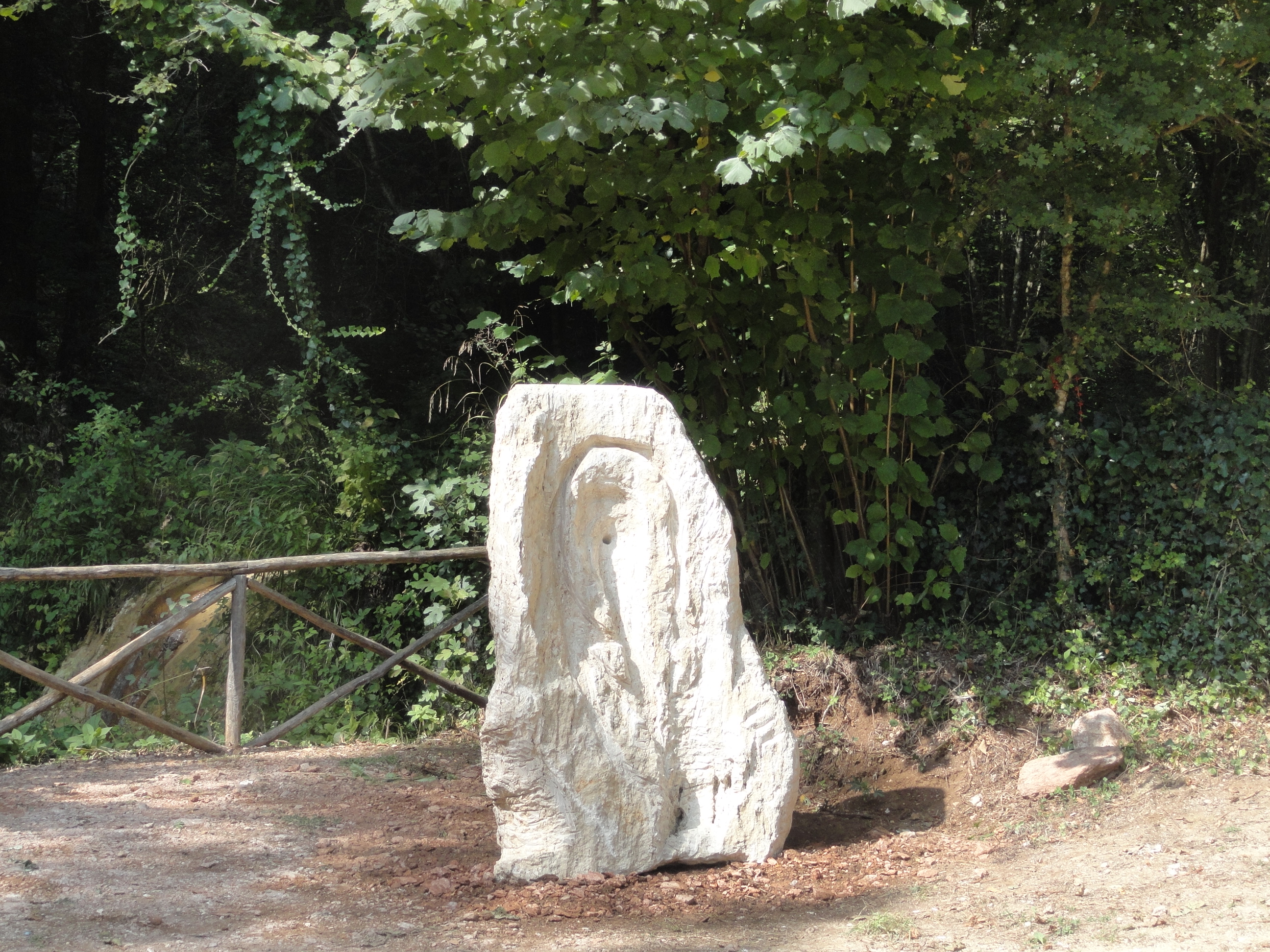 Si algún día subís desde Tívoli a la villa de Horacio, continuad un poco y antes de llegar a Licenza, en un recodo de la carretera os espera el viejo cartel leñoso del Centro Macaruta, que así es el viejo nombre del Giardino dei Cinque Sensi. Recorred el jardín y, pasando el puente de madera caminad hacia la cascada y, tras dejar a la izquierda un huerto, el de Alfonso Maffei que también es el propietario del suelo sobre el que se asienta mi escultura, llegaréis a sus aguas.
