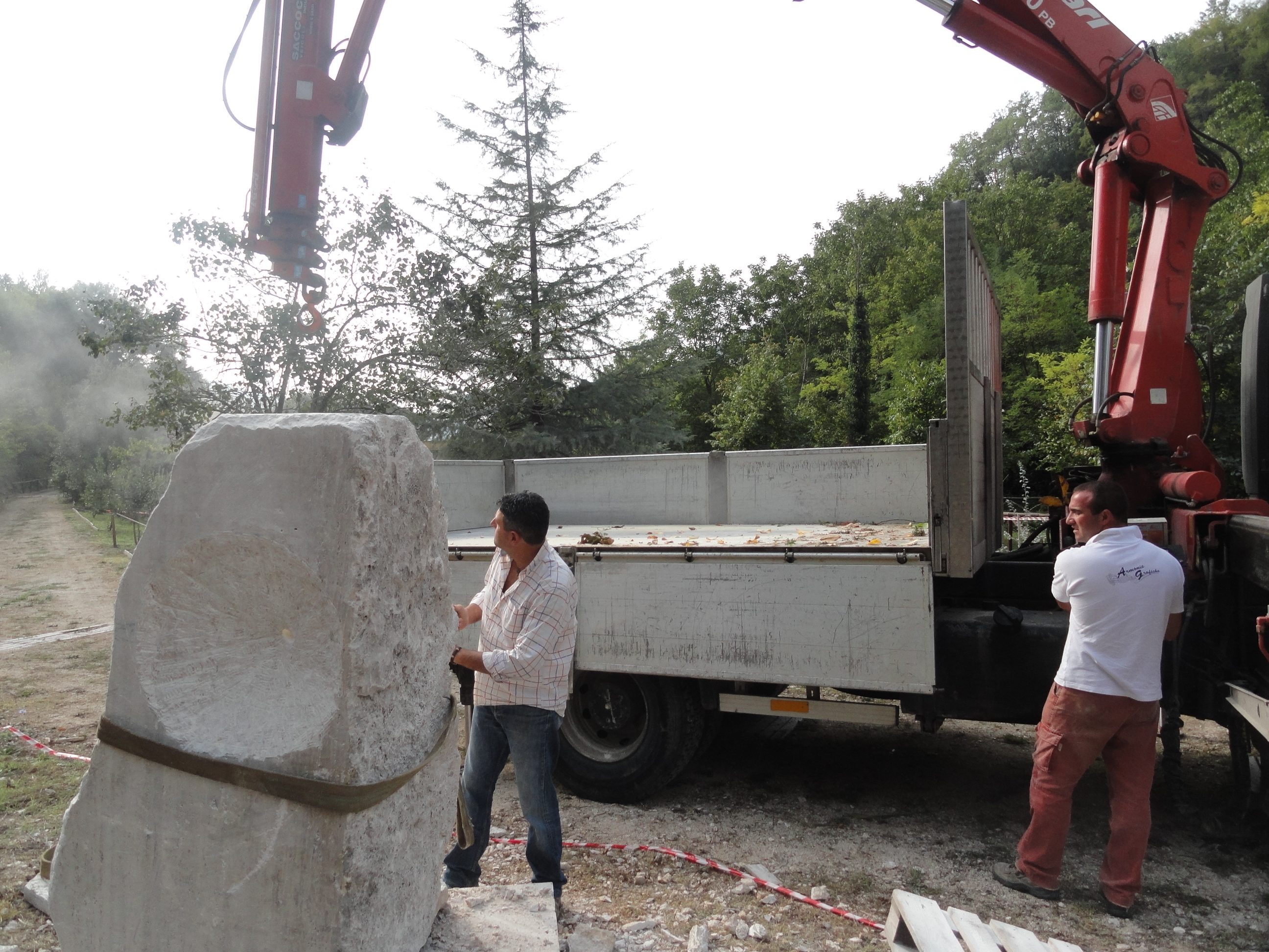 La pericia de Giuseppe y Giovanni fue indispensable para desplazar y colocar adecuadamente los bloques. Gracias a ellos pude dedicar el viernes y el sábado a terminar la obra “in situ” y en su posición definitiva.