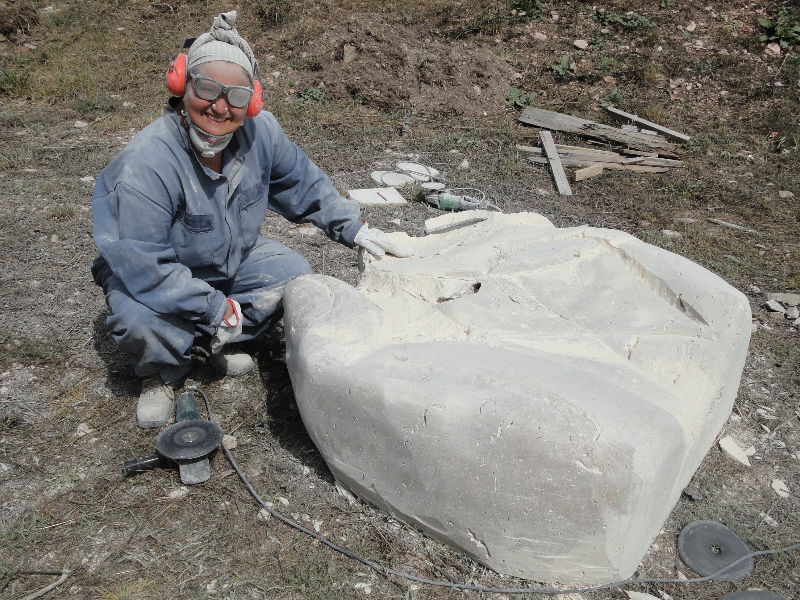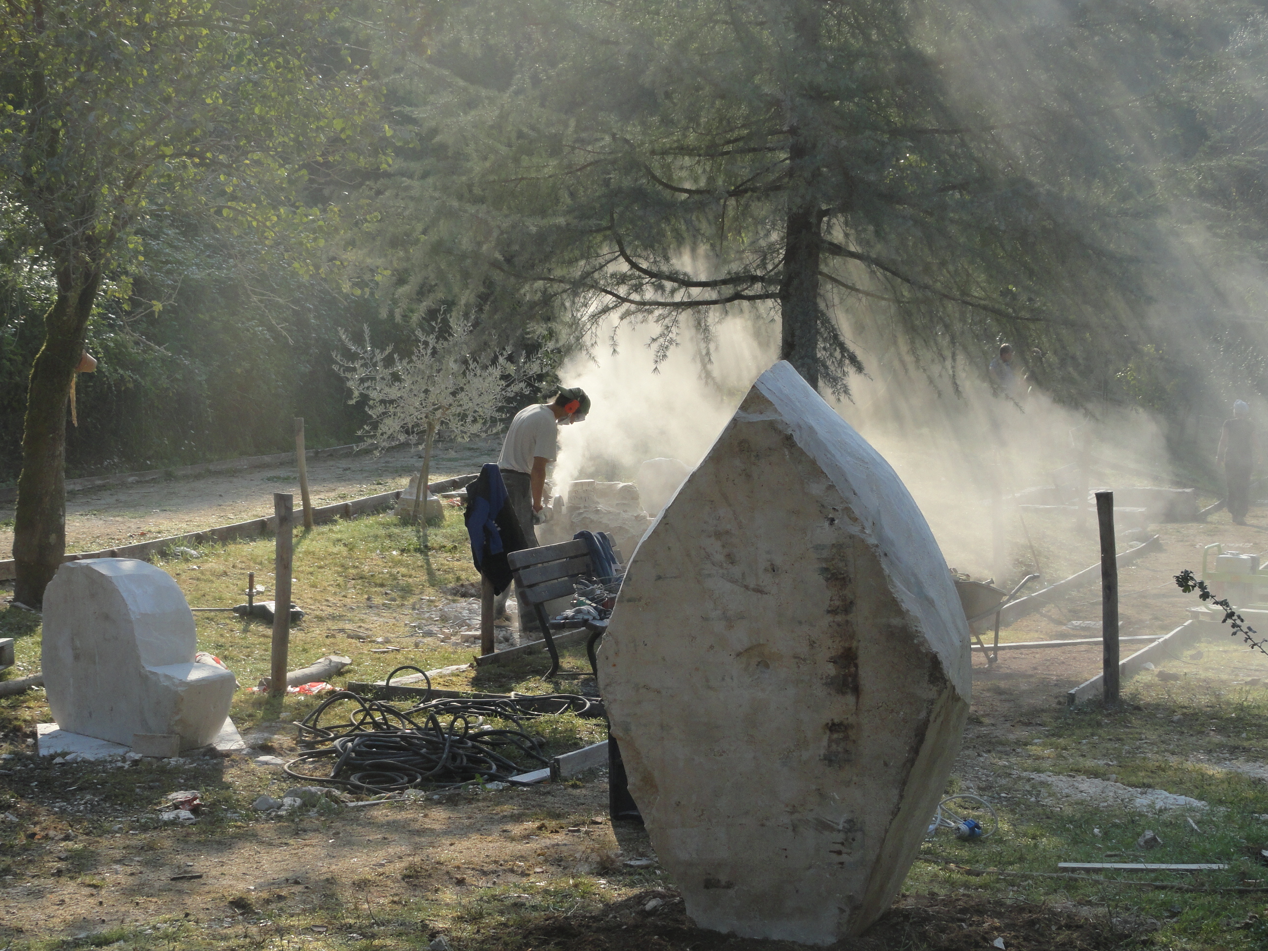 Los ocho escultores (siete alumnos y la profesora Oriana Impei de la Accademia di Belle Arti de Roma) teníamos que acabar nuestras obras en esa semana. Están talladas en bloques de travertino y evocan la sensorialidad y los cinco sentidos. Las esculturas permanecerán en el parque. Hemos empleado hasta tres generadores, prestados por la gerencia del parque, para accionar las herramientas, así como un compresor para los martillos neumáticos. No obstante, una buena parte del trabajo requiere el uso, manual, de mazas, escalpelos y gradinas.
