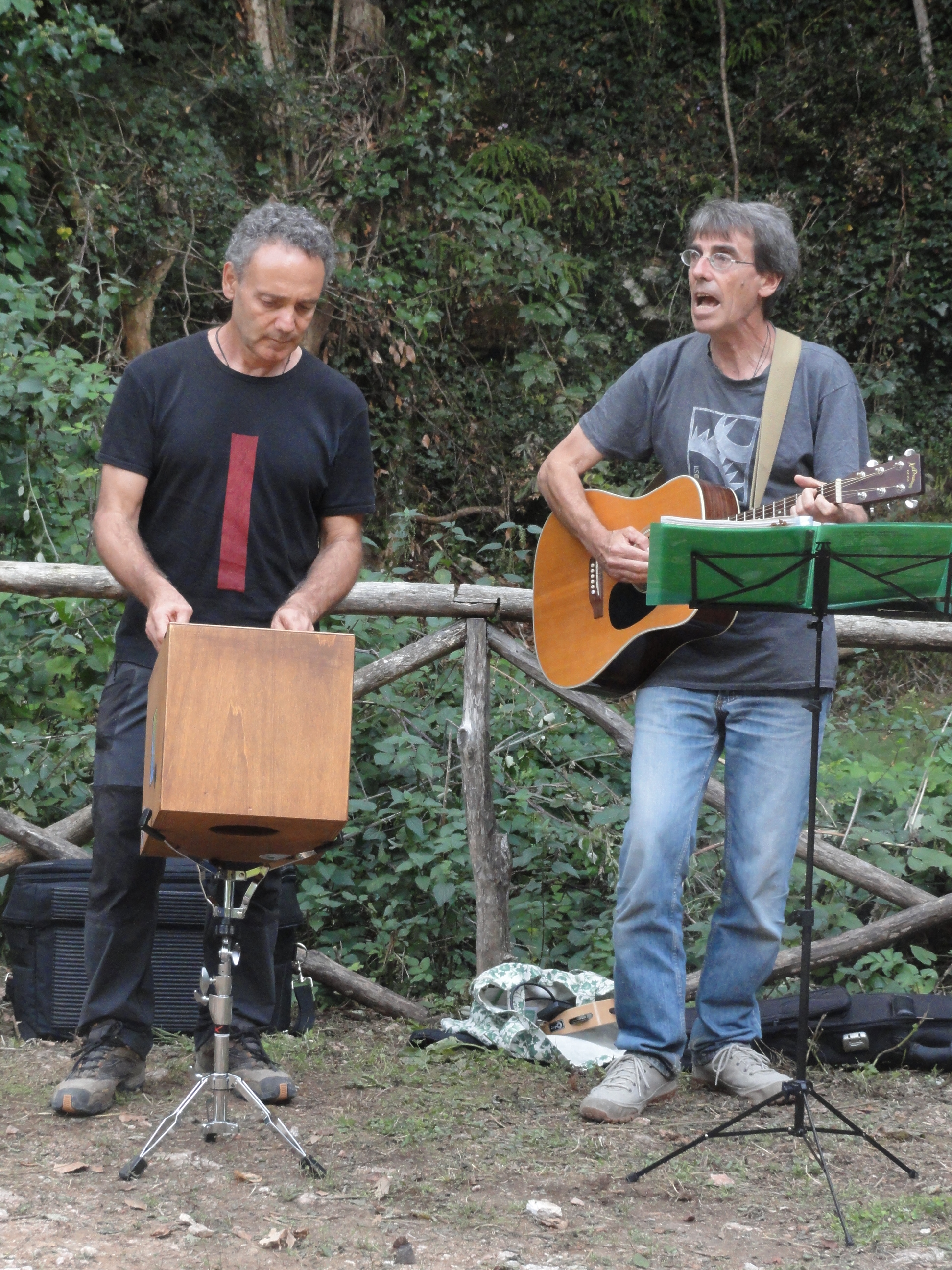 Stefano Panzarasa, responsable de la educación ambiental en el parque, a la guitarra, y Roberto Capotorti interpretan junto a la cascada su canción del “Orecchio verde”, basada en un texto de Gianni Rodari (cuyos “cuentos por teléfono” leía yo a mis hijos hace años a la hora de dormir).