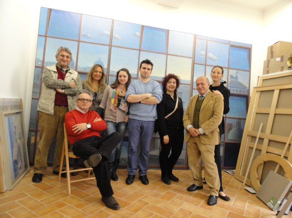 Entre los pintores de la mostra “Ermetiche apparenze, metafísica e pittura” (Centro le Muse, Andria, hasta el 31 de diciembre) destaco a Giuseppe Modica (Mazzara del Vallo, Sicilia, 1953), que ha sido mi profesor en la Accademia di Belle Arti de Roma durante el curso pasado. Aquí le vemos rodeado por algunos de sus alumnos que le visitamos en primavera en su estudio en Roma, no lejos del Coliseo (http://www.giuseppemodica.com/)