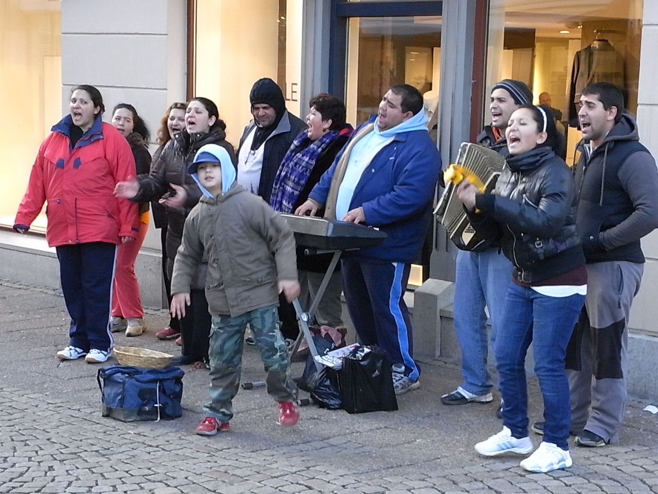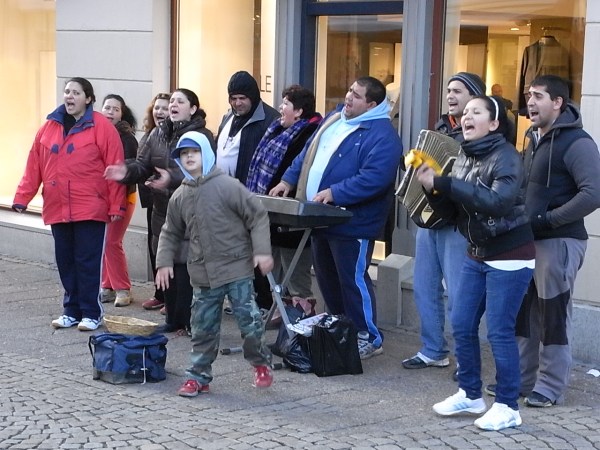 El momento es favorable a los músicos callejeros, en este caso un coro familiar de sufridos migrantes eslovacos, que cantan bien entonados y al que los viandantes merecidamente dan su contribución.