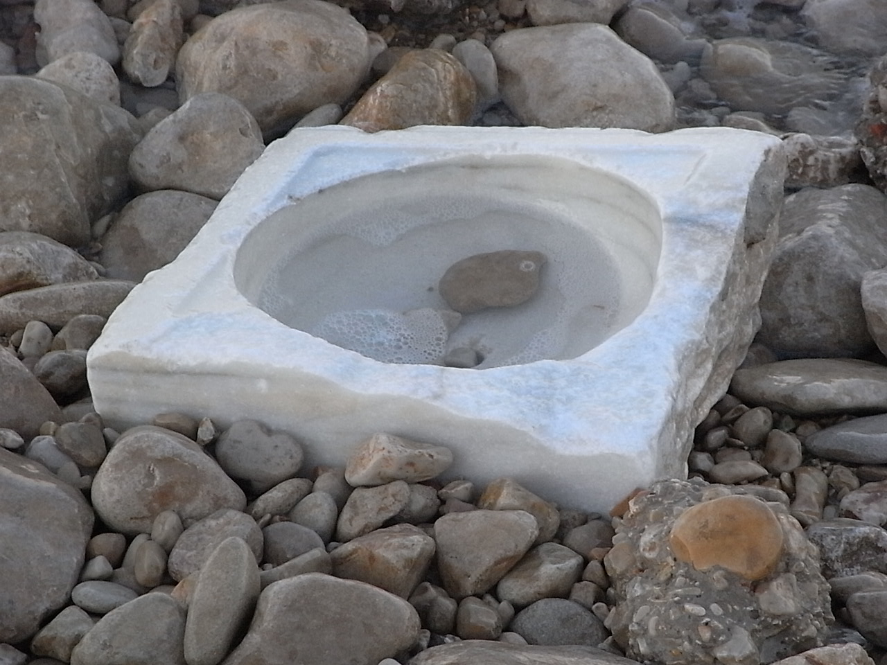 Sobre los cantos rodados de la escollera, al extremo sur de la playa de la Almadraba, aflora una vieja pila de mármol, desgastada -quién sabe durante cuántos años-  por los embates del mar.