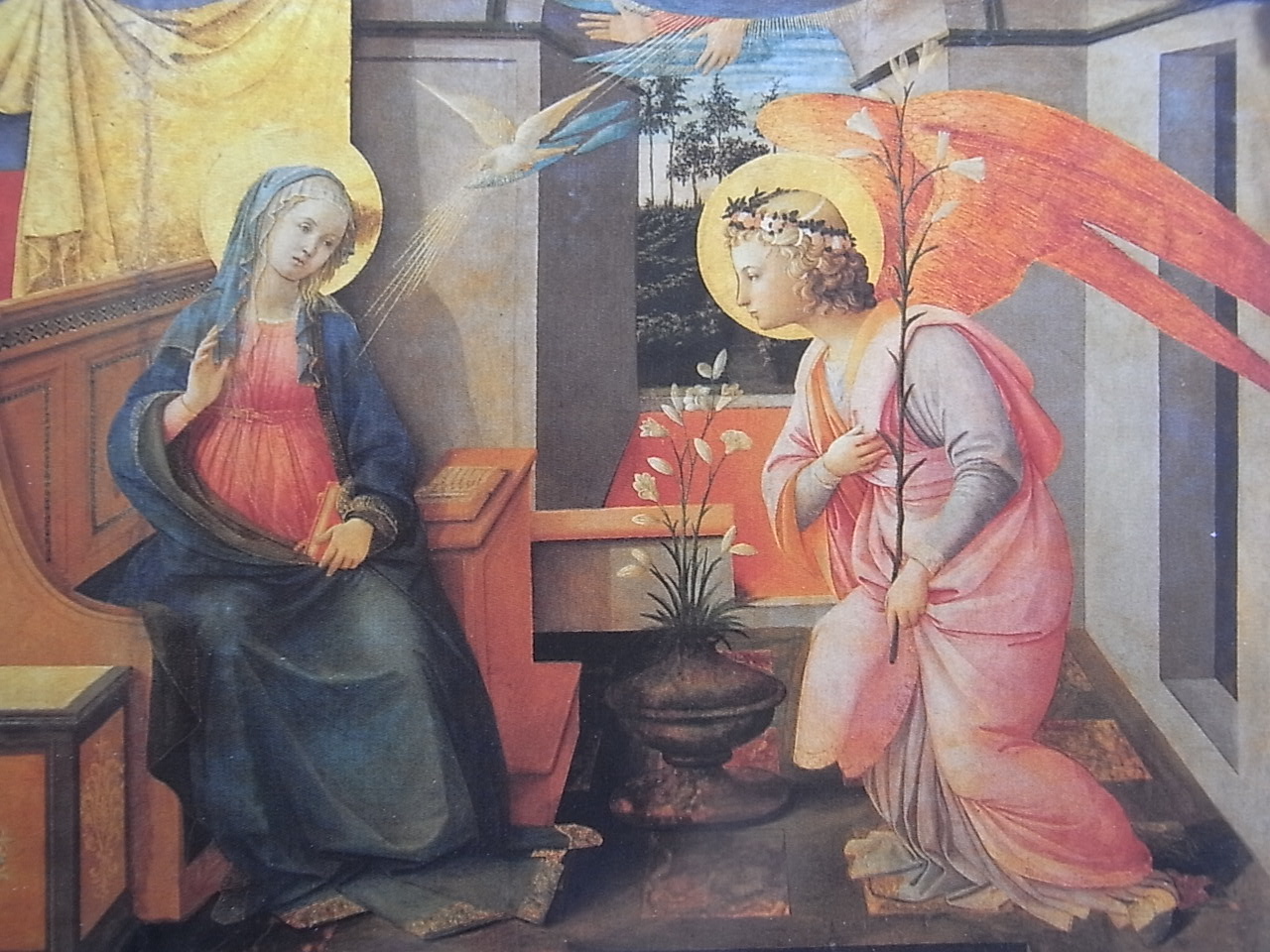 Por ello en la misma Galería, pero -¡ay!- en los inaccesibles apartamentos reservados a los príncipes y a sus visitas, se halla el antídoto devoto contra el irreverente Caravaggio,  una soberbia Anunciación de Filippo Lippi.