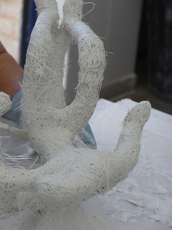 Una vez realizados los baños, se refuerza la pieza ante posibles roturas, con una última capa de papilla y recubierta con fibra de vidrio