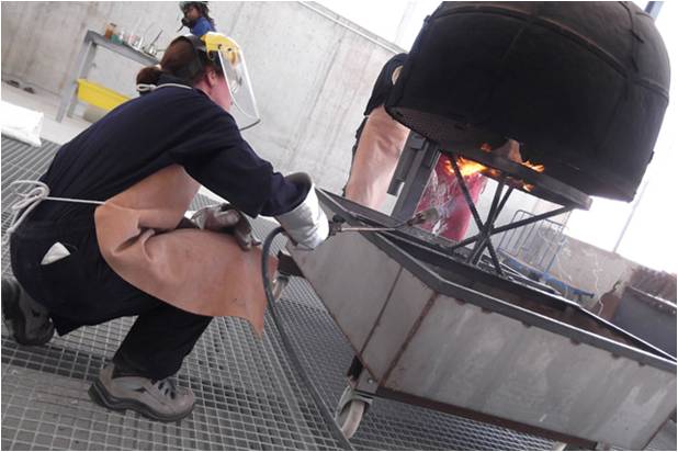 La cascarilla se refuerza con otra capa de papilla, se deja secar, se aspira para limpiar su interior y se calienta antes de que vaya a recibir la colada.
