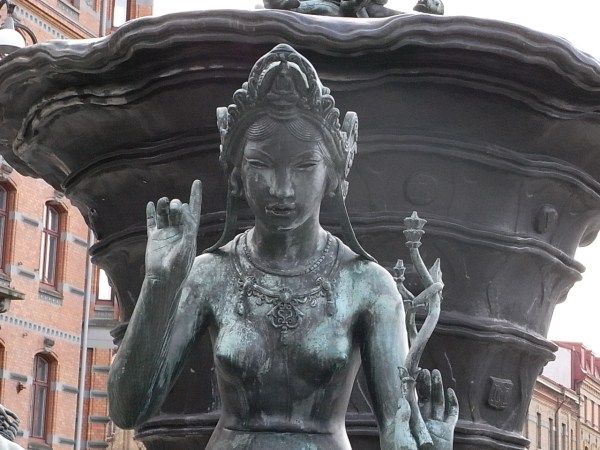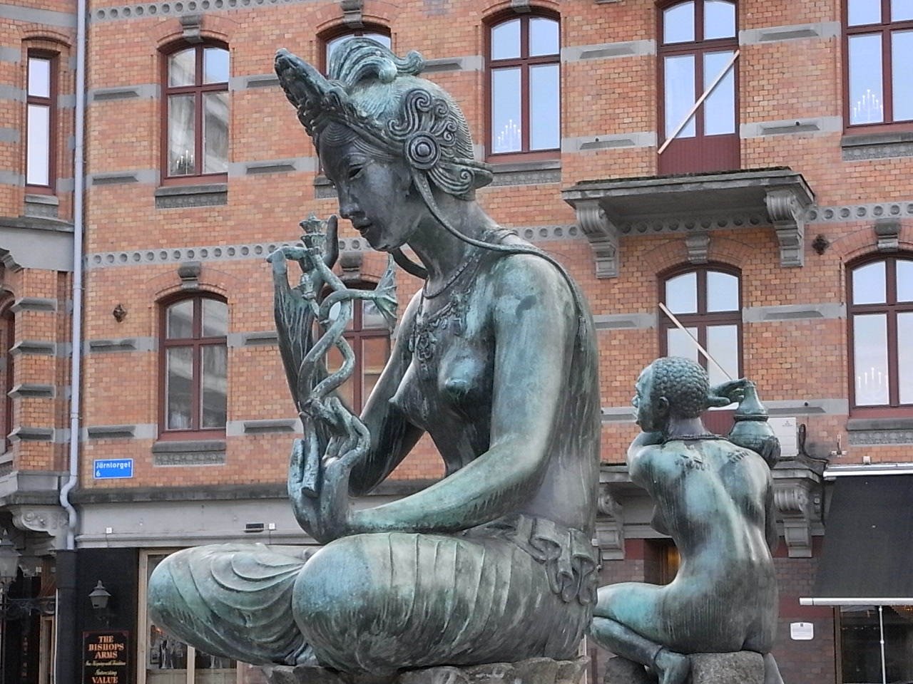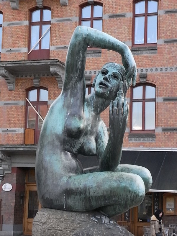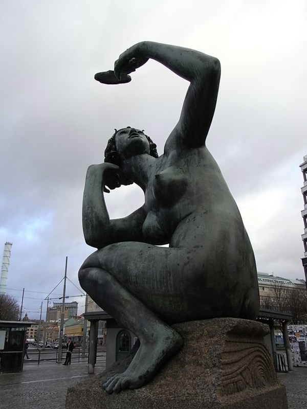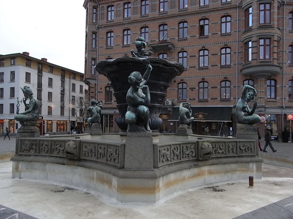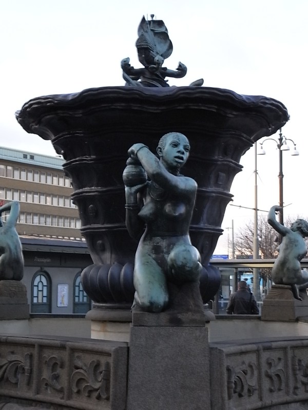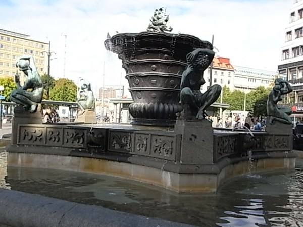 A lo que íbamos: en Gotemburgo hay una hermosa fuente que desde 1927 preside el ajetreo cotidiano de lo que en castellano se traduce como “la plaza de hierro”. El cuerpo principal es de granito y hierro colado. Las figuras son de bronce. Es obra del escultor Tore Strindberg. Se debe a una donación del fondo que a su muerte dejó Charles Felix Lindberg, un comerciante de coloniales y de carbones, un mecenas, natural de Gotemburgo, que legó un gran capital para el embellecimiento de la ciudad. Era un hombre bajito y con sombrero, si nos atenemos a la estatua que le representa en la plaza que lleva su nombre, obra de Jan Steen.
