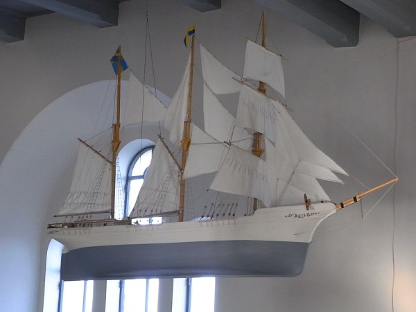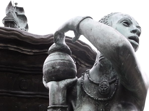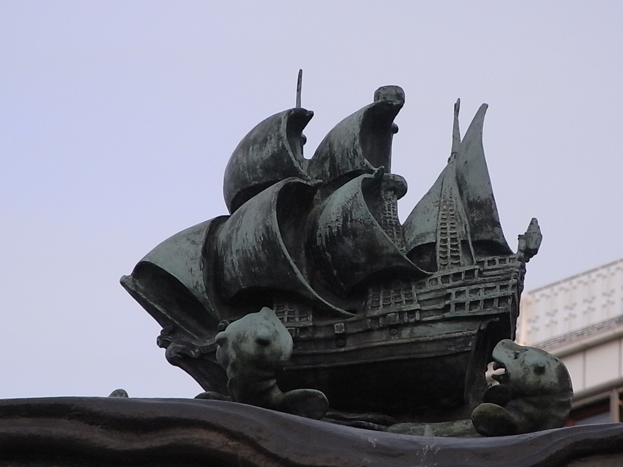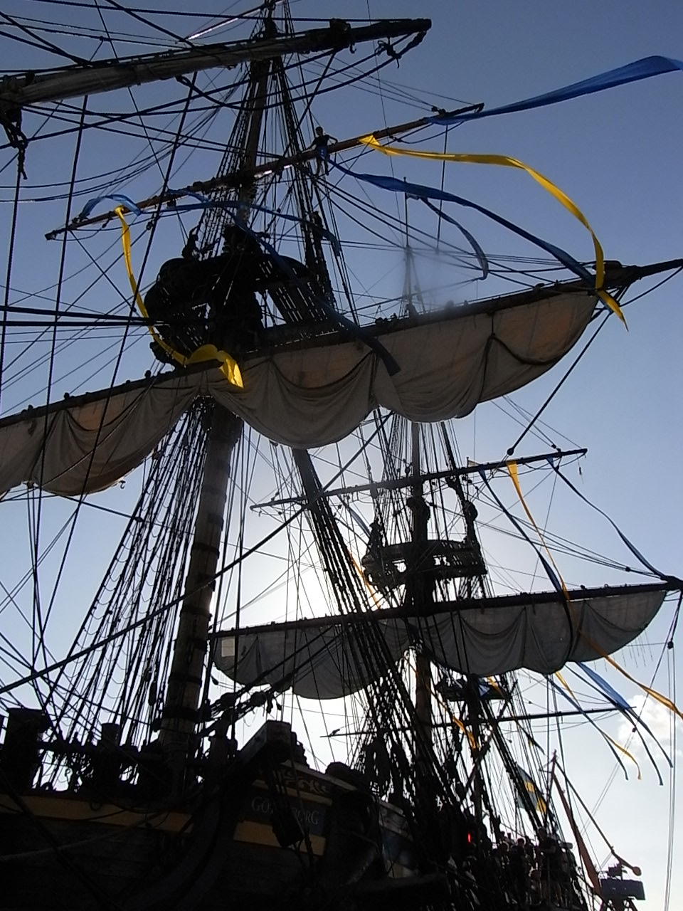 Podría tratarse del barco que, con el viento en popa, afronta a los monstruos marinos para enlazar Gotemburgo con las Indias Orientales, corona la fuente de “las cinco continentes” y simboliza impávido la historia del proceso de mundialización, que durante siglos ha dado prosperidad a los países occidentales y que ahora se la cuestiona.