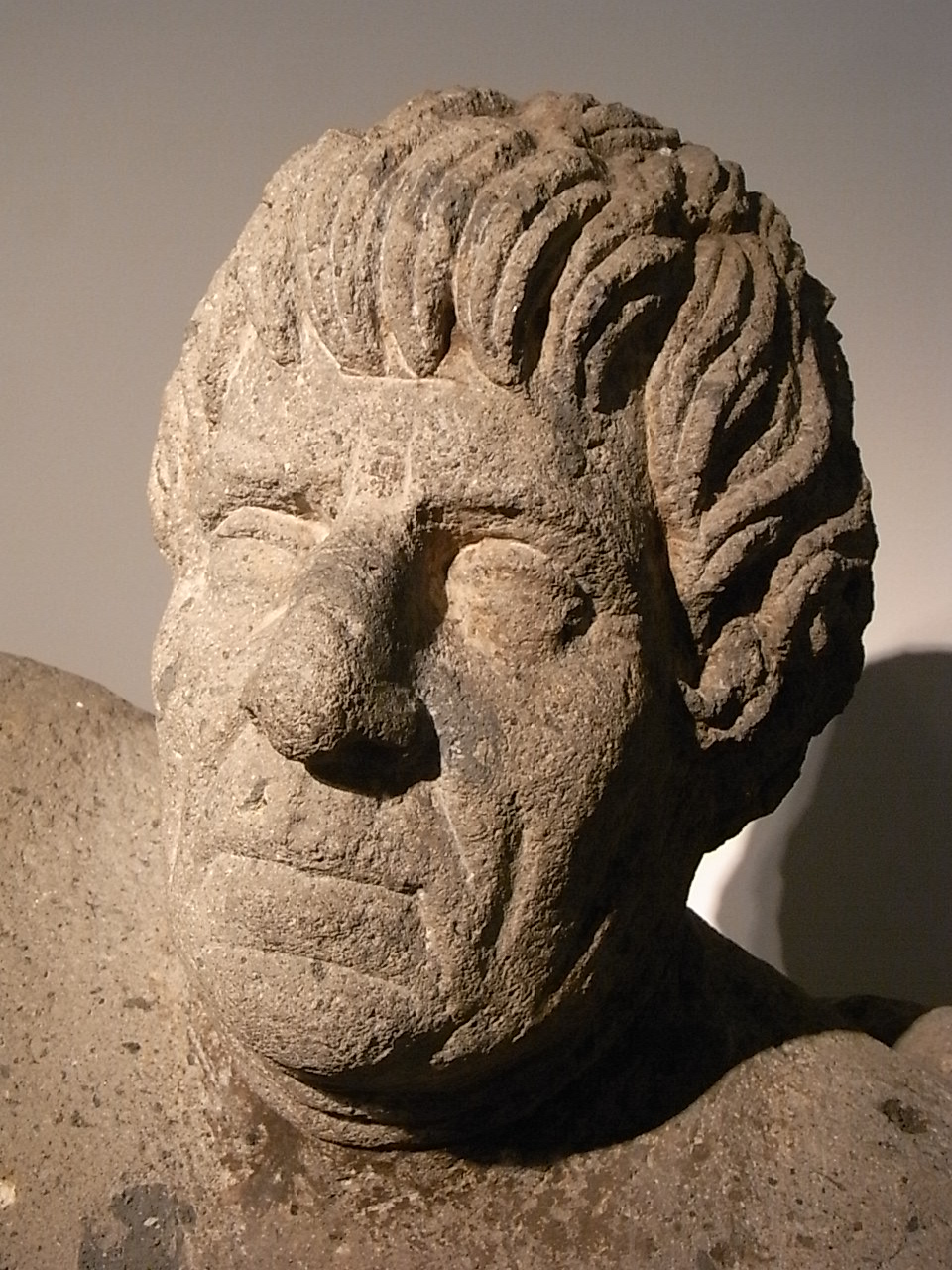 El siguiente rostro parece inacabado, sin que el escultor lo haya pulido. Quizás el comanditario no quedó satisfecho o no tuvo el dinero para pagarlo. Pero está bien así, con sus rasgos duramente tallados y un rictus escéptico en los labios. Se trata de alguien a quien una biografía de legionario curtido parece haber cincelado las facciones.