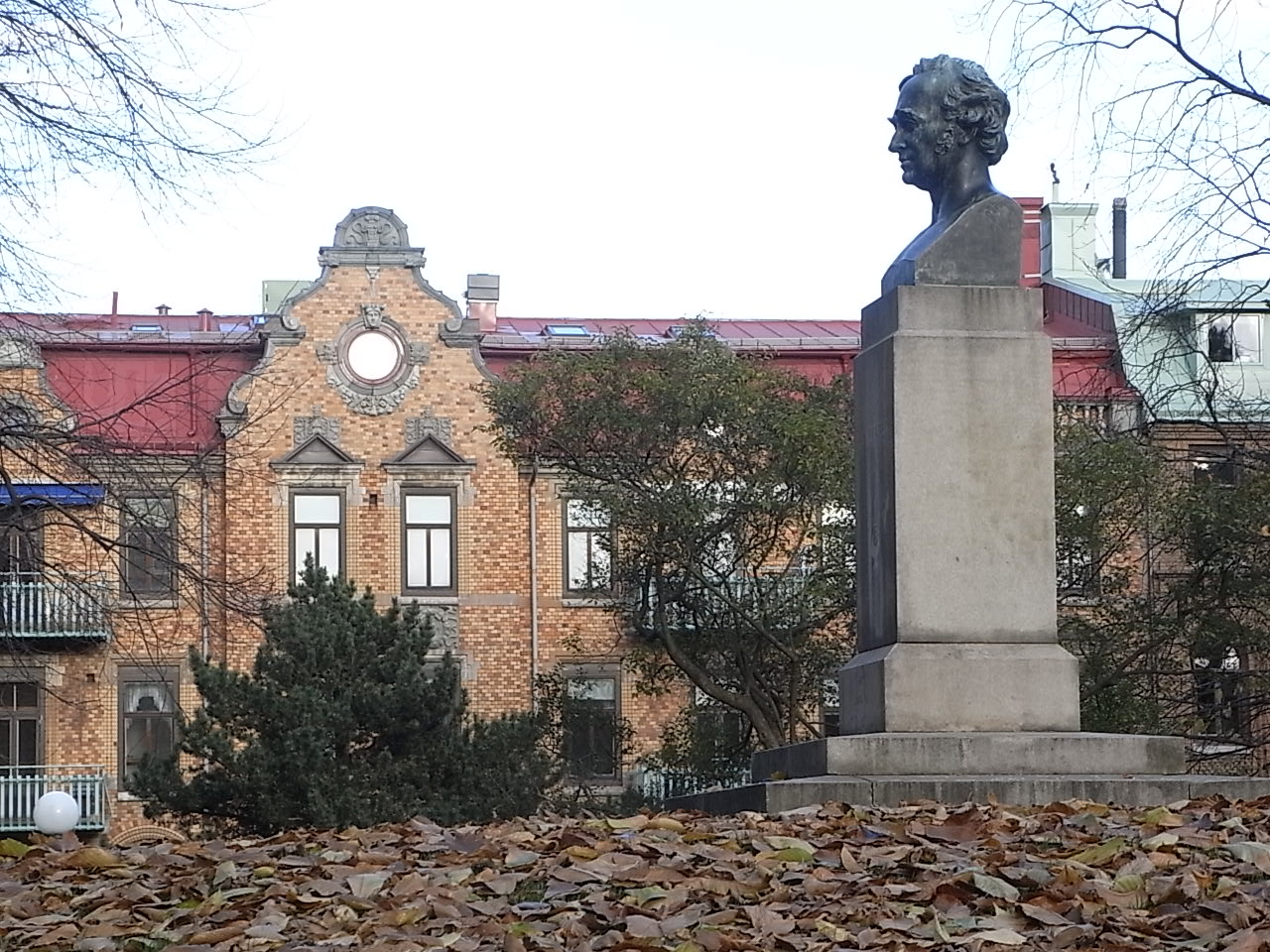 Su busto se alza en el parque Vasa sobre una pequeña colina que da nombre a la calle adyacente, la Götabergsgatan (la calle de la colina), cubierta en estos días de un tapiz de hojas caídas. Pocos aquí saben quien fue, pero su canto a la sabiduría del otoño rima bien con estas veredas cubiertas de fugaces oros.