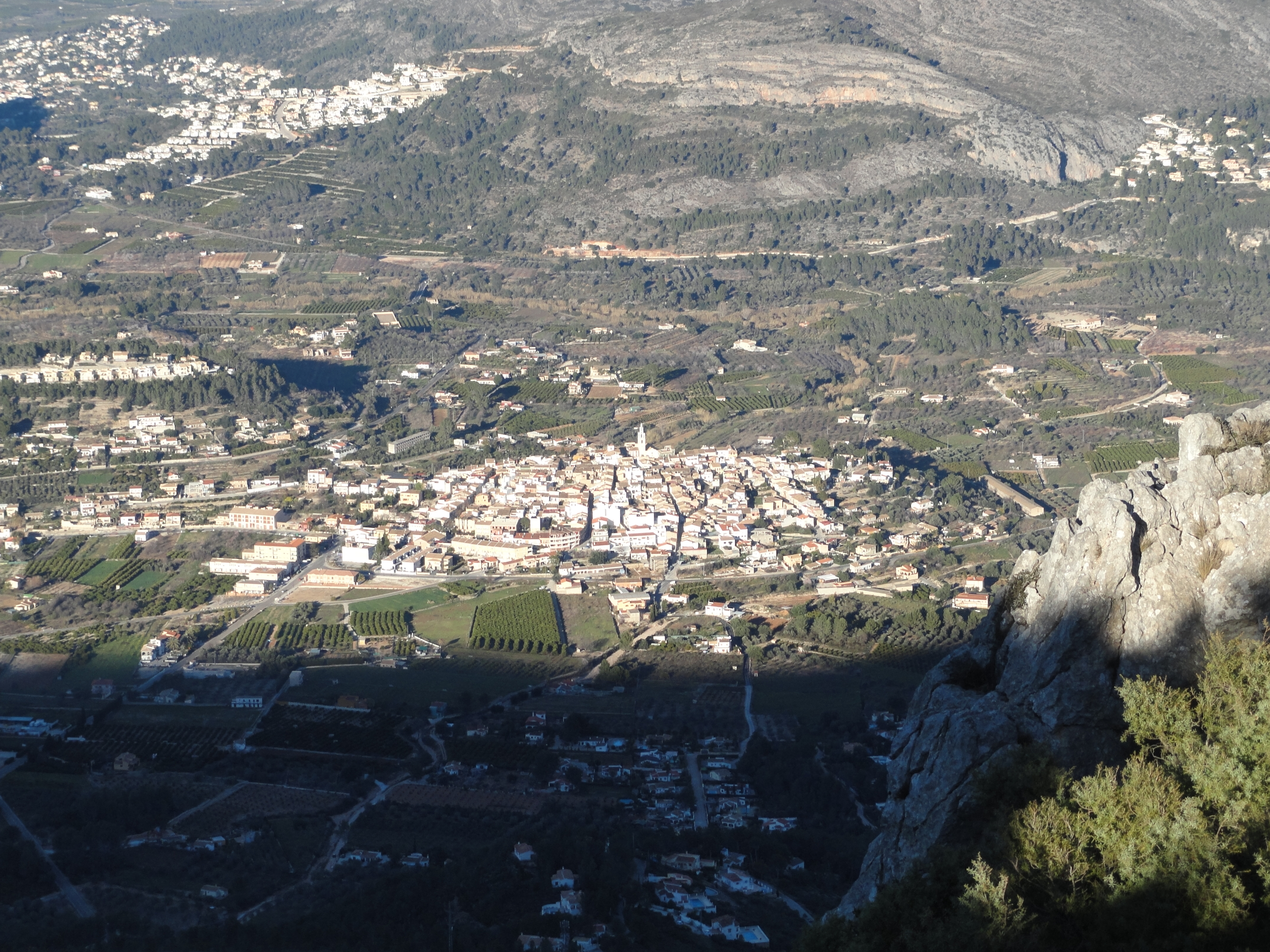 Muchos pueblos de la Marina Alta se divisan desde aquí: Parcent justo a nuestros pies, Alcalalí, La Llosa de Camacho, Pedreguer, Orba, Murla, Jávea… Se avistan las alturas del Montgó, del Segaria y de la Safor y, como el día es clarísimo, se percibe lejana la cumbre del Peñagolosa en la provincia de Castellón, la más alta de la Comunidad Valenciana. A lo lejos en la línea del horizonte se vislumbra Ibiza y, como una pequeña sombra, Formentera.