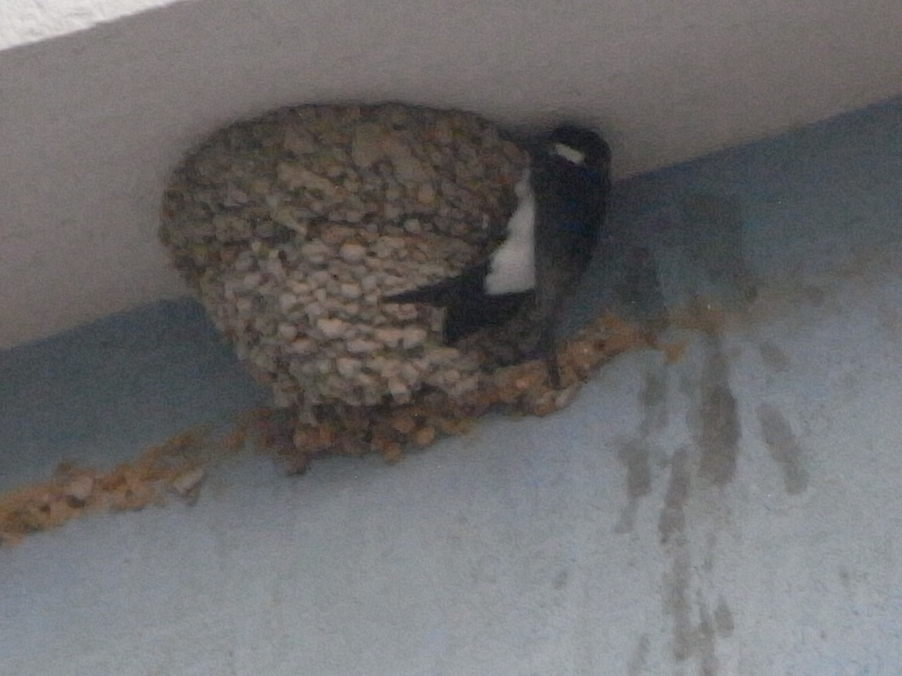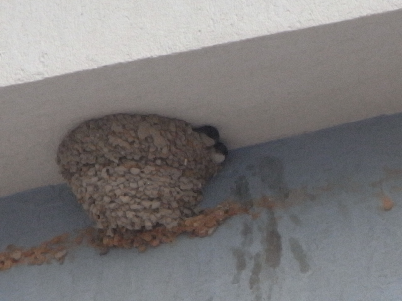 Aquí no son las cigüeñas sino las golondrinas las que han vuelto a anidar (y a poner perdida la pared del vecino); las crías piando y aguardando a la madre.