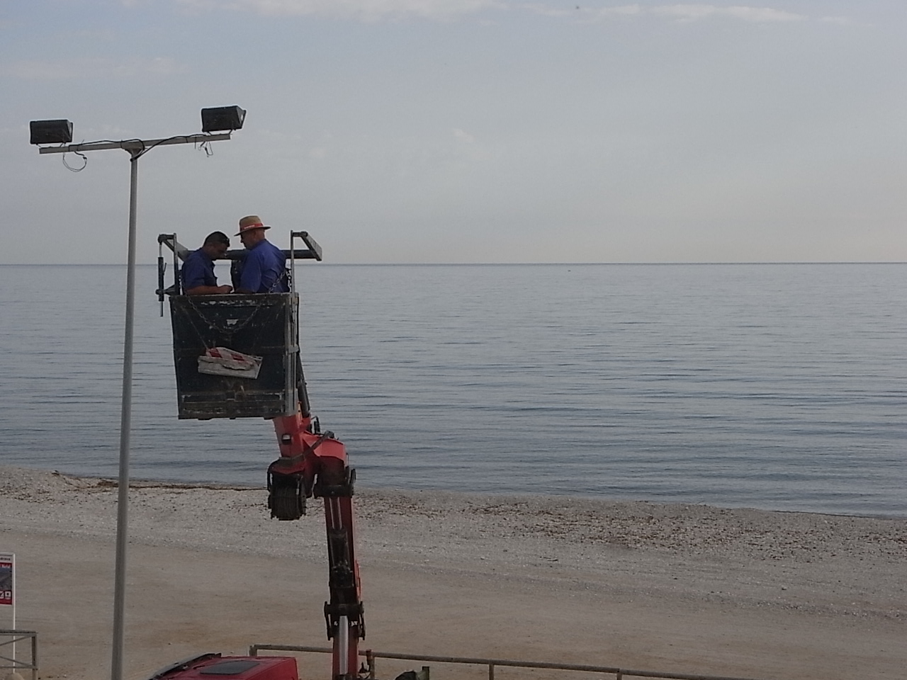 Al día siguiente, los obreros del ayuntamiento han venido a preparar los focos para la noche de San Juan.
