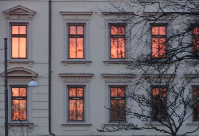 sus reflejos incendian las fachadas al atardecer