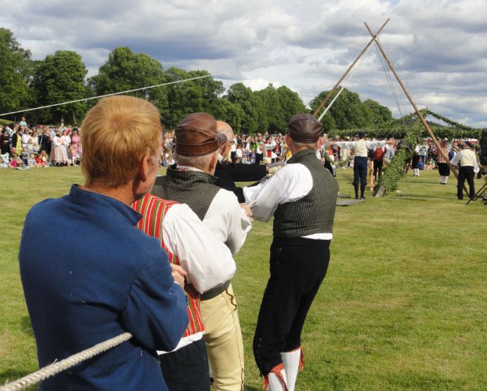 En Nääs la erección del Midsommarstång es tarea de expertos. Es una labor que con precisión y maestría se reproduce cada año. La mayoría de los que tiran de las maromas rondan los setenta años
