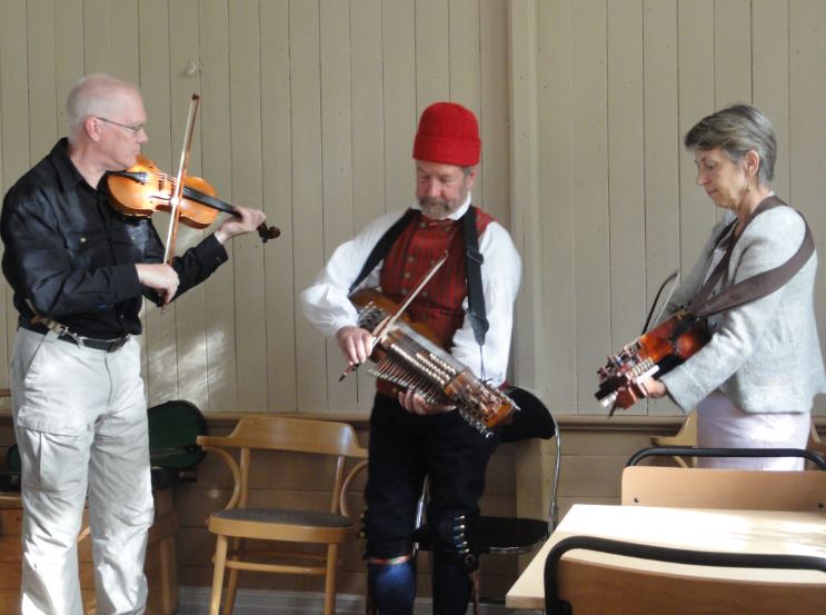 Aquí lleva la batuta, mejor dicho una antigua arpa de llaves  («nickelharpa»), un músico experimentado, en su atuendo de gala.
