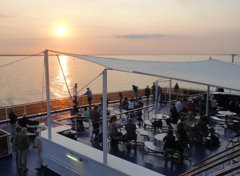 En las cubiertas del Stena Danica hay, según se mire, un ambiente tanto de final como de comienzo de vacaciones:  hay viajeros alemanes de subida hacia sus destinos campestres en Suecia o Noruega, y suecos y noruegos de vuelta de sus baños de sol y mar en el continente.  Son estos los que más se explayan, cerveza en mano en el bar del puente superior de la nave, donde devoro un canapé de gambas y una hamburguesa doble,  preparados y servidos por empleadas filipinas.