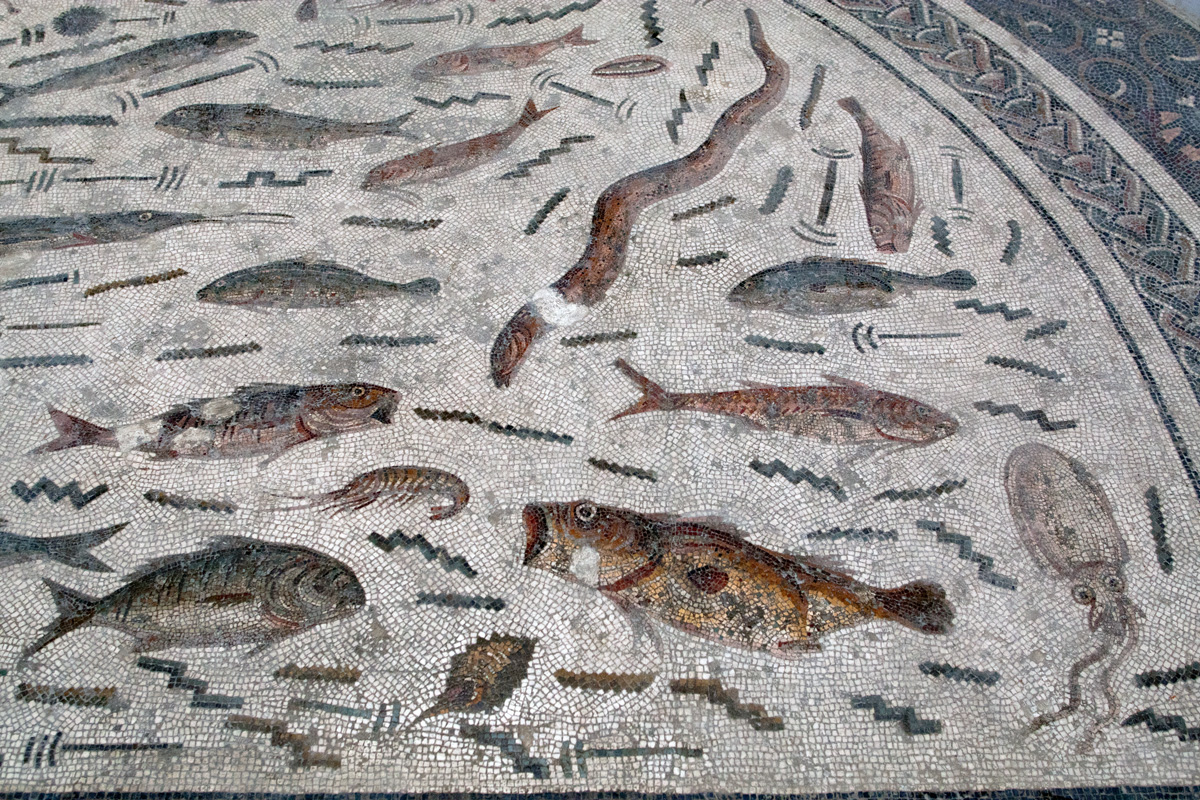 Peces mediterráneos. Mosaico romano. Museo del Bardo. Túnez. Fuente Wikimedia