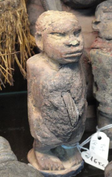 Pequeño fetiche de 10 cm de altura, tallado en madera, conteniendo en su interior substancia mágica cubierta con una mezcla de barro y alquitrán natural. Pertenece al pueblo Teke, que habita las orillas del río Congo, cerca de Kinshasa y de Brazzaville. (Catálogo FC 16).