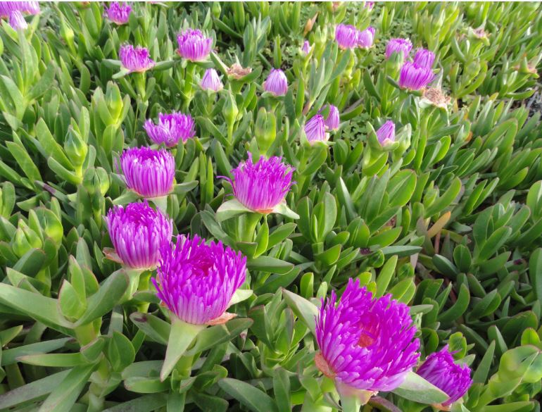 Cerca del mar, sobre la arena, se extiende espontáneo el Carpobrotus edulis con sus flores moradas que, cuando abren, muestran unos pistilos de un pálido amarillo anaranjado. Es una planta humilde, que se arrastra a baja altura y persiste en sus colores de Viernes Santo, cuando hace ya días que las campanas tocaron a Gloria.