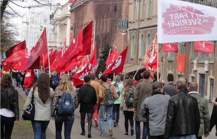 Pero cuando bajé a la calle ya estaban desfilaba los Socialdemócratas y los sindicatos afines. Aún siendo festivo, su estilo era bastante más marcial que el de Iniciativa Feminista.