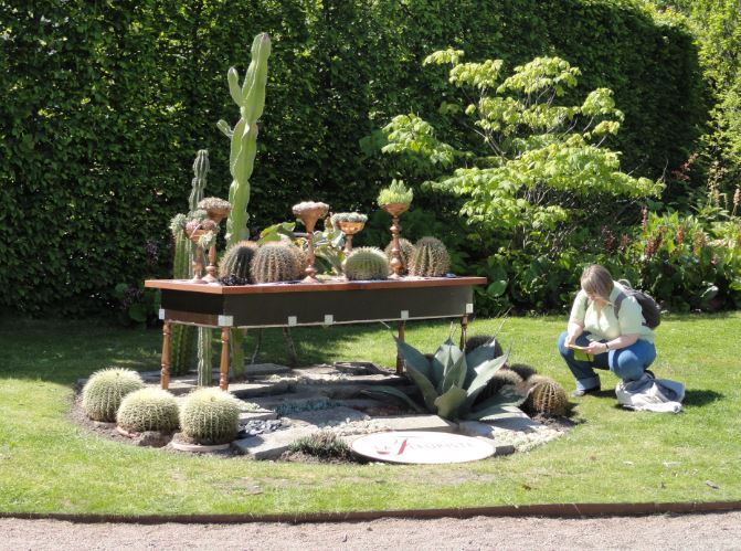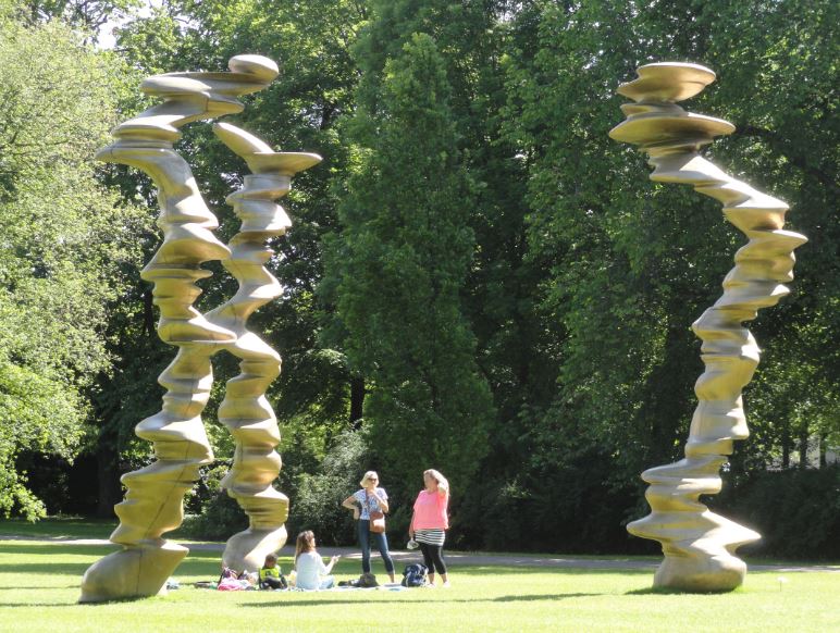 El manto verde del césped invita a descansar a la sombra de las esculturas polimorfas de Tony Cragg.